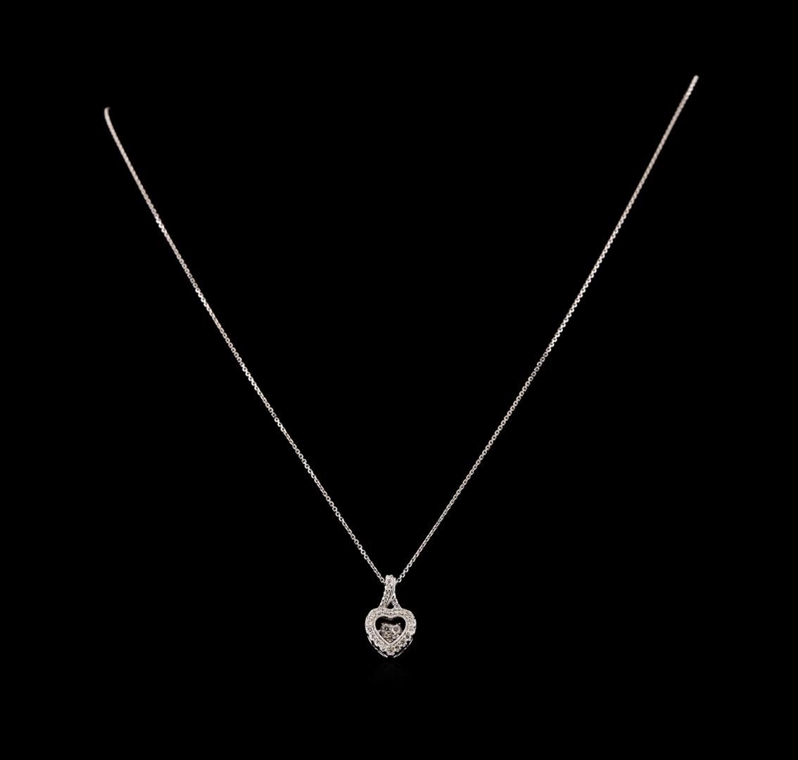 One electronically tested 14KT white gold lady's combination cast & assembled heart shape pendant & chain 18.0' long, 1mm diamond cut oval cable link with a spring ring clasp with a bright polish with milgrain detailing finish. The featured lady's heart shaped pendant has a heart shaped dancing diamond motif. Identified with markings of '14K'. Condition is new, good workmanship. Containing: Three prong set round brilliant cut diamonds, measuring 1.60 - 1.50 x 0.96mm (depth est.) approximate total weight of 3 Stones = 0.04ct. Graded in the setting. Clarity SI-1 to SI-2. Color: H - I Cut Good Seventeen prong set round brilliant cut diamonds, measuring 1.40 - 1.35 x 0.86mm (depth est.) approximate total weight of 17 Stones = 0.17ct. Graded in the setting. Clarity SI-1 to SI-2. Color: G - H Cut Good Eight prong set round brilliant cut diamonds, measuring 1.15 - 1.05 x 0.68mm (depth est.) approximate total weight of 8 Stones = 0.04ct. Graded in the setting. Clarity SI-1 to SI-2. Color: H - I Cut Good. Total Weight of Diamonds 0.25ct.. Total Weight of Pendant & Chain 2.90gm. GAS Appraised at $1,350.00.