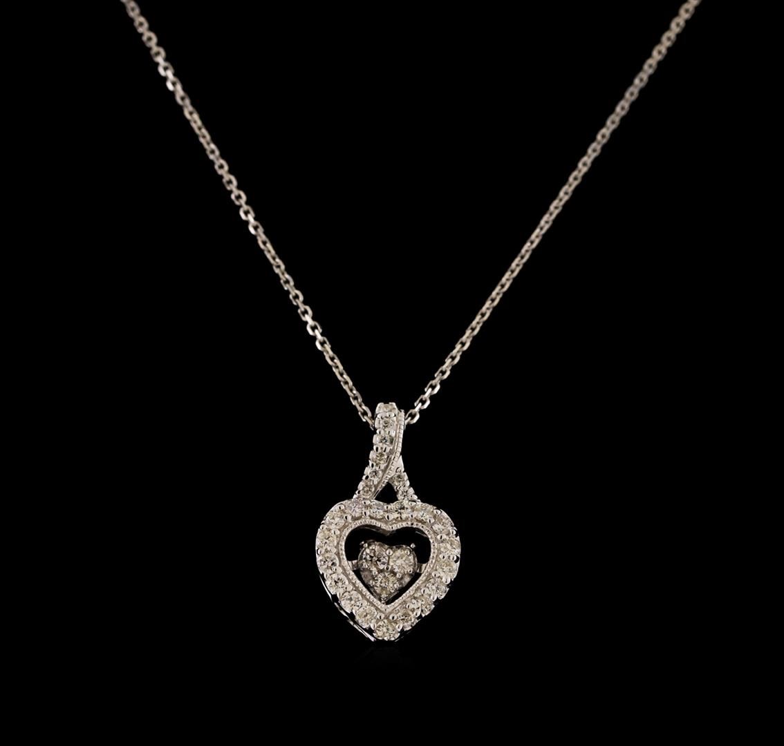 One electronically tested 14KT white gold lady's combination cast & assembled heart shape pendant & chain 18.0' long, 1mm diamond cut oval cable link with a spring ring clasp with a bright polish with milgrain detailing finish. The featured lady's heart shaped pendant has a heart shaped dancing diamond motif. Identified with markings of '14K'. Condition is new, good workmanship. Containing: Three prong set round brilliant cut diamonds, measuring 1.60 - 1.50 x 0.96mm (depth est.) approximate total weight of 3 Stones = 0.04ct. Graded in the setting. Clarity SI-1 to SI-2. Color: H - I Cut Good Seventeen prong set round brilliant cut diamonds, measuring 1.40 - 1.35 x 0.86mm (depth est.) approximate total weight of 17 Stones = 0.17ct. Graded in the setting. Clarity SI-1 to SI-2. Color: G - H Cut Good Eight prong set round brilliant cut diamonds, measuring 1.15 - 1.05 x 0.68mm (depth est.) approximate total weight of 8 Stones = 0.04ct. Graded in the setting. Clarity SI-1 to SI-2. Color: H - I Cut Good. Total Weight of Diamonds 0.25ct.. Total Weight of Pendant & Chain 2.90gm. GAS Appraised at $1,350.00.