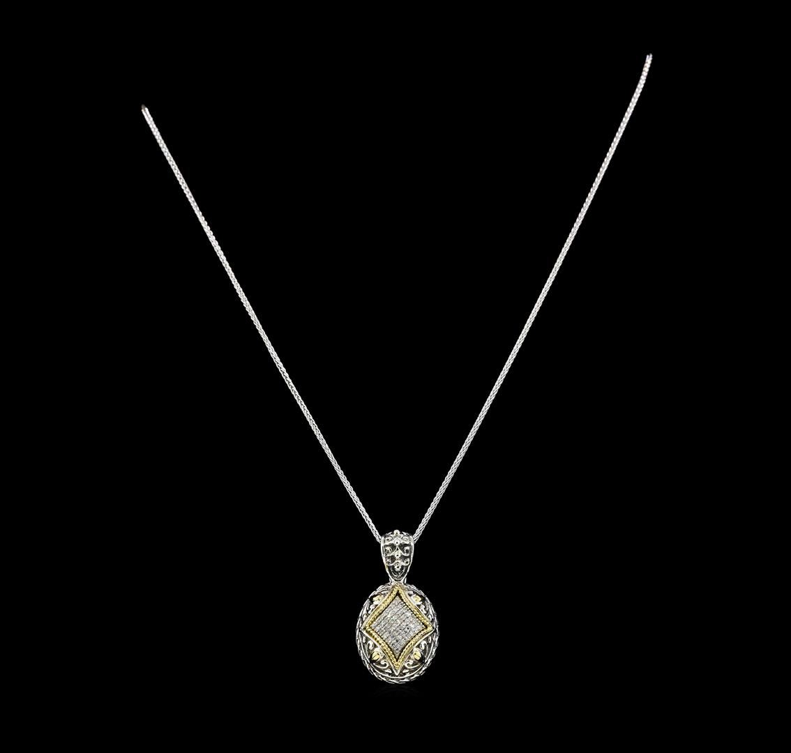 One electronically tested silver/18KT yellow gold lady's combination cast & assembled fashion pendant & chain 20.0' long, 1.3mm wheat link with a lobster claw clasp with a bright polish finish. The featured lady's pendant is part of the Balissima by EFFY collection. The pendant has an 18K white gold chain, a bail with a foldover clasp and 18K yellow gold inlaid in.925 silver. Trademark is Effy. Identified with markings of '18K / 925'. Condition is new, good workmanship. Containing: Forty-Nine prong set single cut diamonds, measuring 1.15 - 1.05 x 0.68mm (depth est.) approximate total weight of 49 Stones = 0.25ct. Graded in the setting. Clarity VS-2 to SI-1. Color: H - I Cut Good. Total Weight of Diamonds 0.25ct.. Total Weight of Pendant & Chain 13.60gm GAS Appraised at $1,250.00.