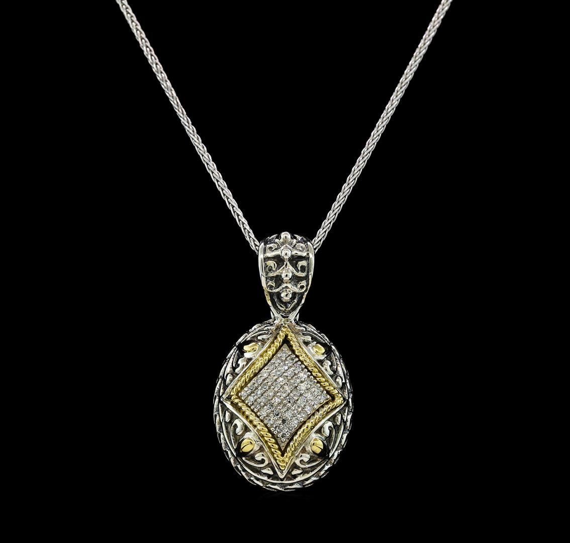 One electronically tested silver/18KT yellow gold lady's combination cast & assembled fashion pendant & chain 20.0' long, 1.3mm wheat link with a lobster claw clasp with a bright polish finish. The featured lady's pendant is part of the Balissima by EFFY collection. The pendant has an 18K white gold chain, a bail with a foldover clasp and 18K yellow gold inlaid in.925 silver. Trademark is Effy. Identified with markings of '18K / 925'. Condition is new, good workmanship. Containing: Forty-Nine prong set single cut diamonds, measuring 1.15 - 1.05 x 0.68mm (depth est.) approximate total weight of 49 Stones = 0.25ct. Graded in the setting. Clarity VS-2 to SI-1. Color: H - I Cut Good. Total Weight of Diamonds 0.25ct.. Total Weight of Pendant & Chain 13.60gm GAS Appraised.