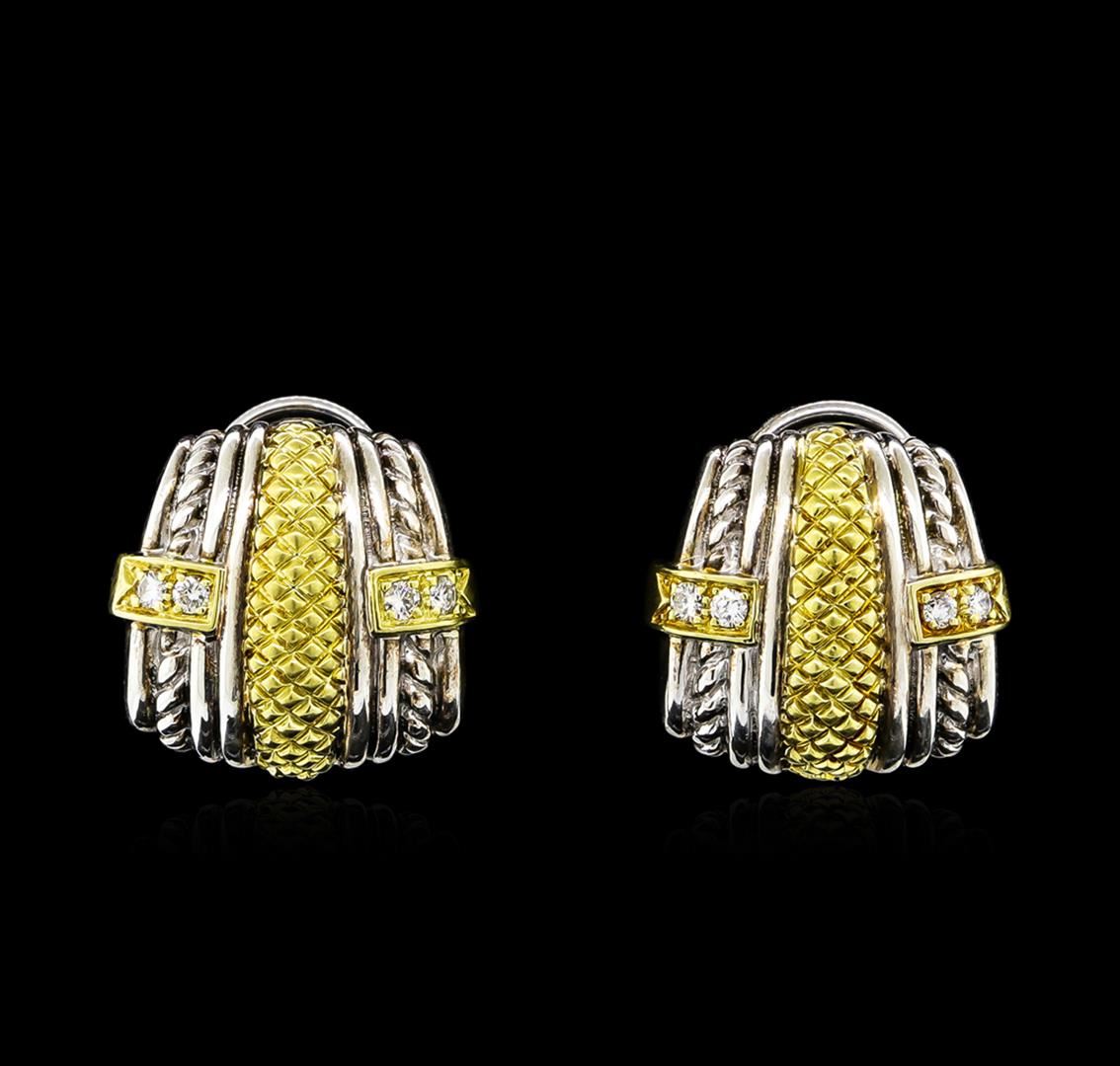 One pair electronically tested 925 silver ladies cast & assembled diamond earrings with omega backs. Each earring is part of Judith Ripka's Two Collection. Two mirroring diamond ribbons accent either side of the rope detailed gallery. Bright polish finish with 18KT yellow gold accents. Trademark is JR TWO. Identified with markings of "925 18K". Condition is good. Containing: Eight bead set round brilliant cut diamonds, measuring 2.00 - 2.00 x 1.20mm (depth est.) approximate total weight of 8 Stones = 0.25ct. Graded in the setting. Clarity: SI-1 to SI-2. Color: F - G. Total Weight of Diamonds 0.25ct. Total Weight of Earrings 19.10gm. AIG Appraised at $990.00.