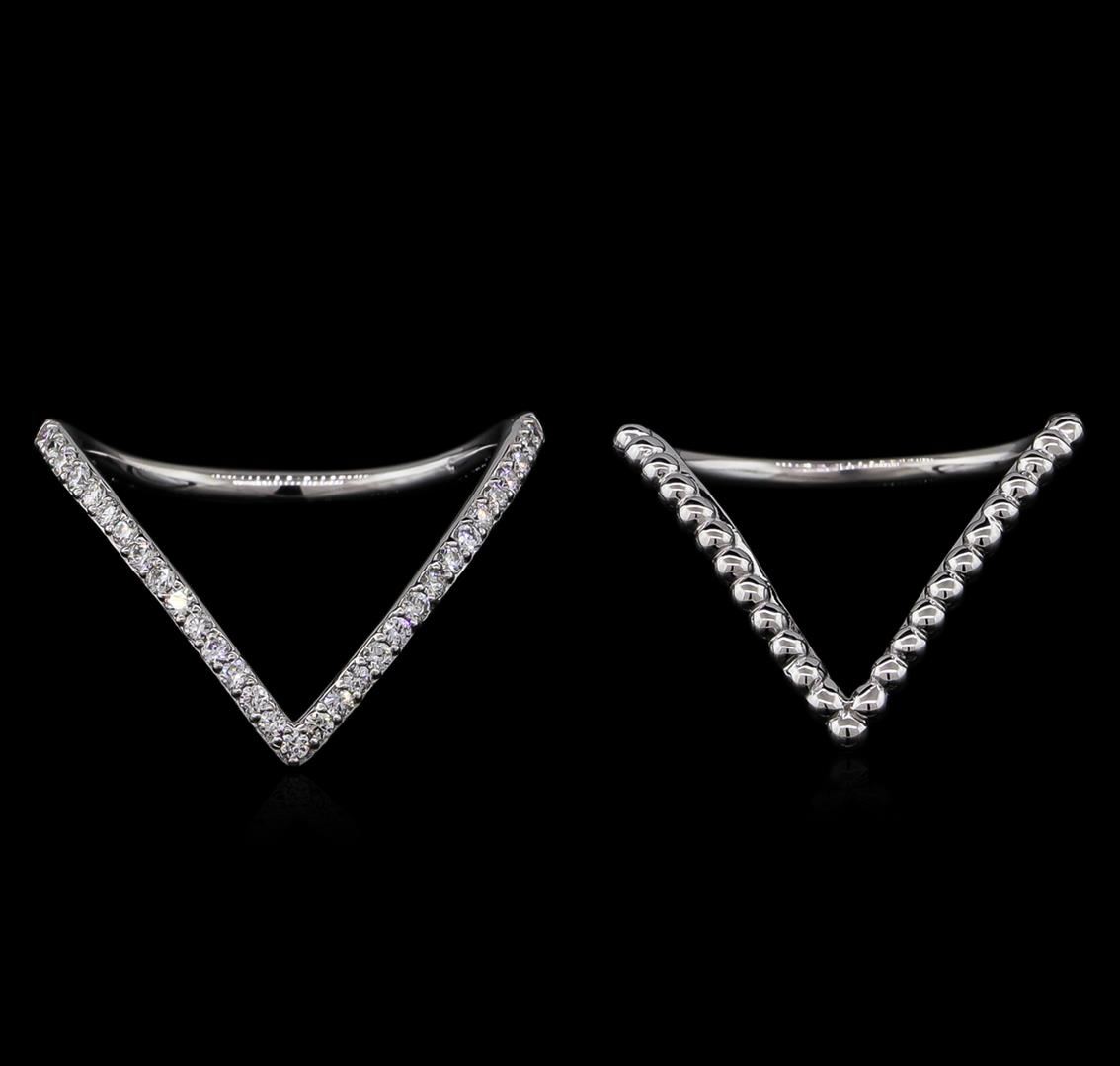 One v-shape twin ring set featuring: 14KT white gold weighing 3.37 grams containing diamonds with a total weight of 0.25ct.