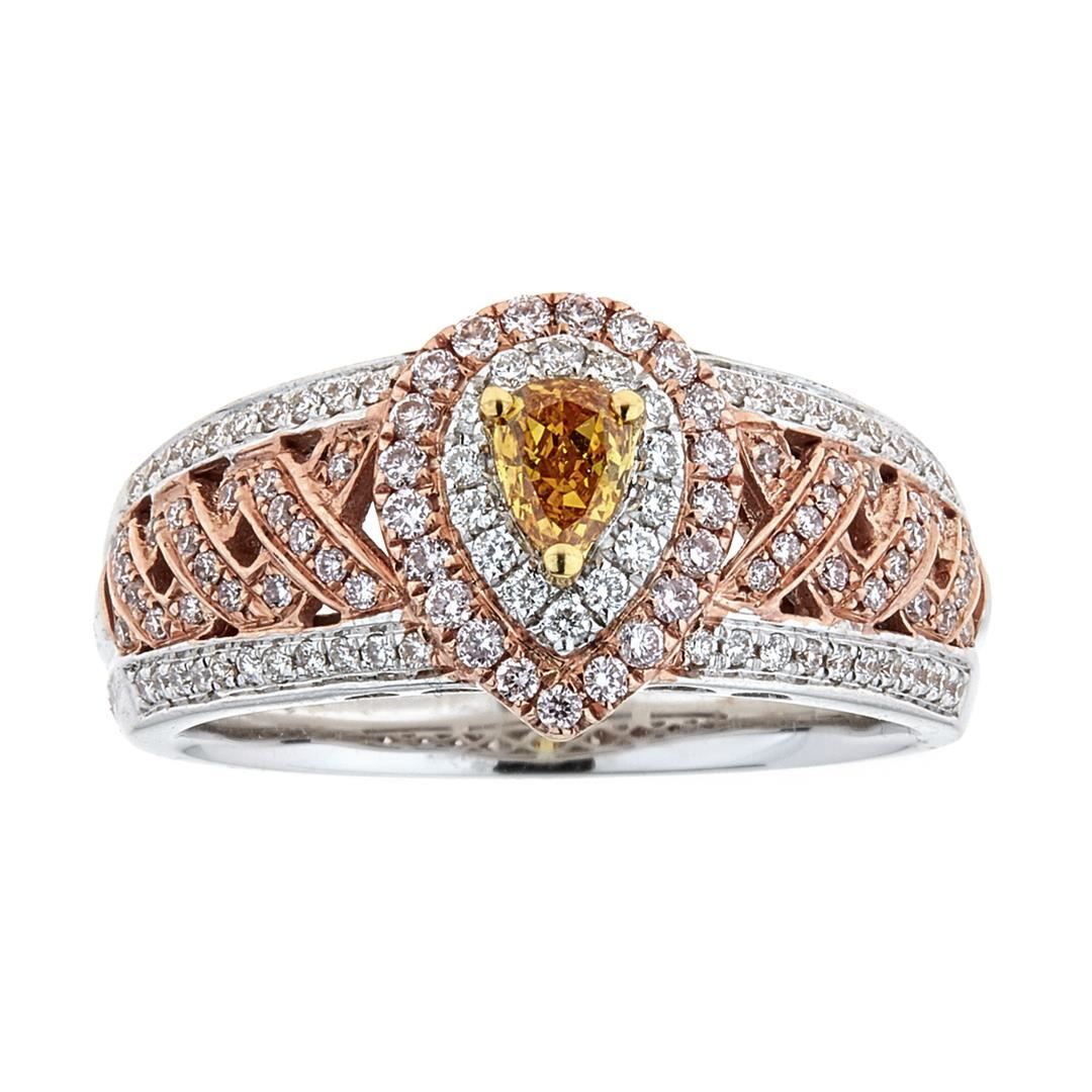 One Lady's Multicolor Diamond Ring. Setting: 18 Kt. Rose and White Gold Mounting. Additional: 59 Round Pink Diamonds = 0.25 Cts. TWT (Pink/VS-SI) and 56 Round White Diamonds = 0.20 Cts. TWT (G-H/VS-SI). Official/Approximate Weight of Center: 0.25 Carats. Cut: Pear Brilliant. Color: Fancy Intense Yellow. Clarity: VS1. Measurements: 5.10 x 3.23 mm. Total Weight: 7.16 grams.