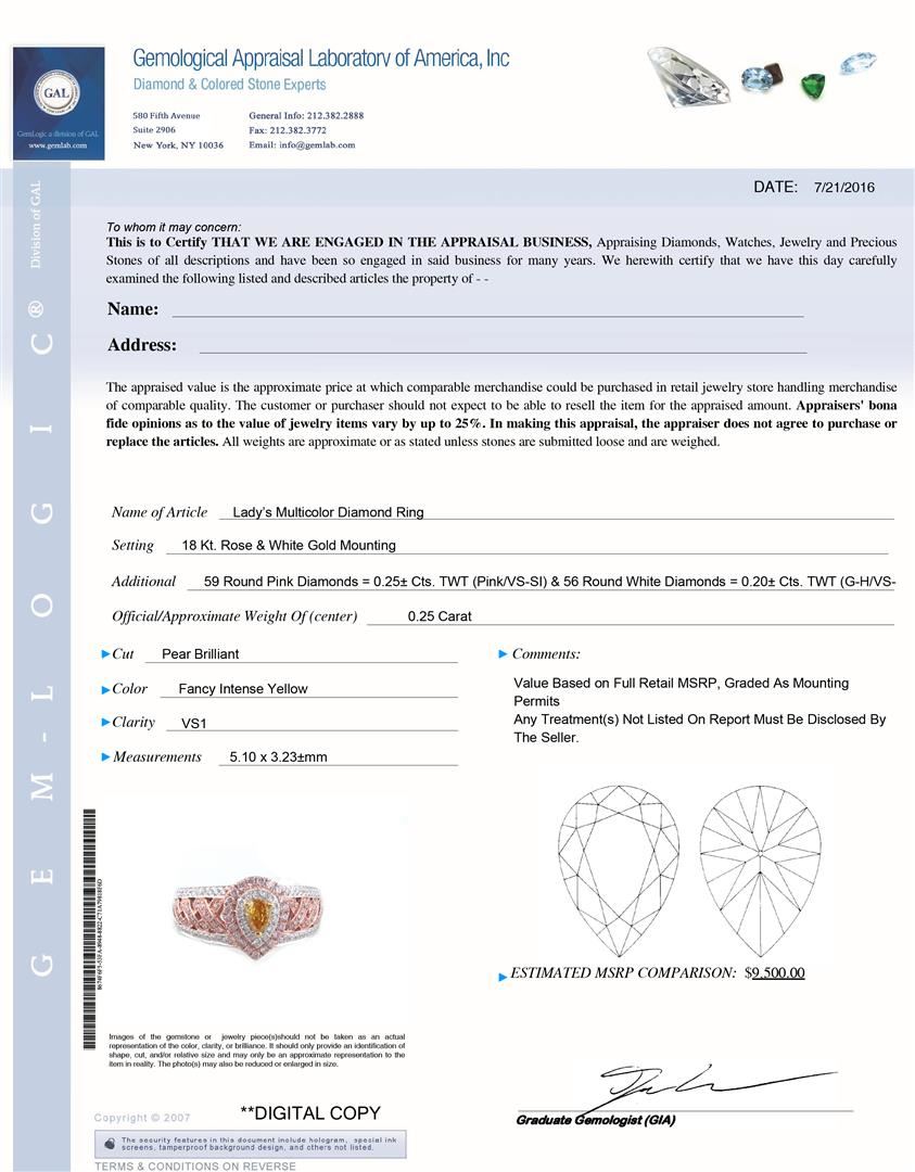 One Lady's Multicolor Diamond Ring. Setting: 18 Kt. Rose and White Gold Mounting. Additional: 59 Round Pink Diamonds = 0.25 Cts. TWT (Pink/VS-SI) and 56 Round White Diamonds = 0.20 Cts. TWT (G-H/VS-SI). Official/Approximate Weight of Center: 0.25 Carats. Cut: Pear Brilliant. Color: Fancy Intense Yellow. Clarity: VS1. Measurements: 5.10 x 3.23 mm. Total Weight: 7.16 grams.