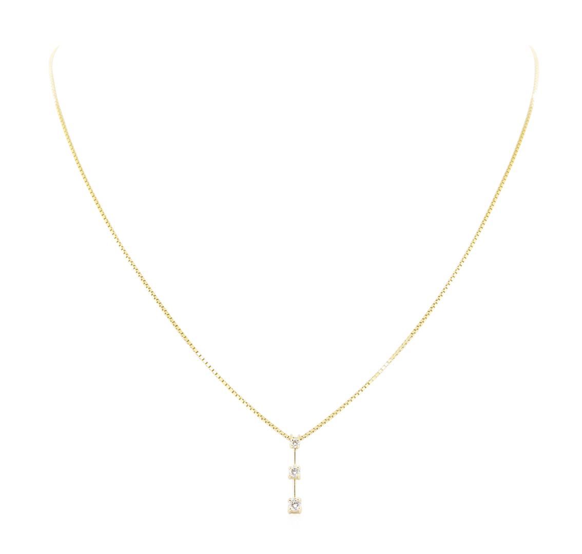 One Past, Present, Future diamond three stone pendant with an attached eighteen inch box link chain featuring: 14KT yellow gold weighing 4.0 grams containing diamonds weighing 0.25ctw.