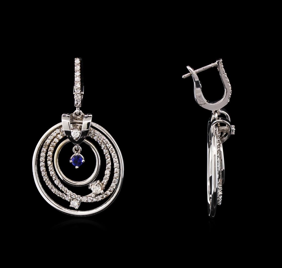 One pair electronically tested 14KT white gold ladies cast & assembled diamond and sapphire dangle earrings with hinged, snap locking posts. Bright polish finish. Identified with markings of "K14". Condition is new, good workmanship. Containing: One Hundred Fifty-Six prong set round brilliant cut diamonds, measuring 2.10 - 1.10 x 0.96mm exact total weight 156 Stones = 1.22ct. Graded in the setting. Clarity: SI-1 to I-1. Color: G - I Two prong set round mixed cut natural blue sapphires, measuring 3.10 - 3.00 x 1.98 mm, exact total weight 0.25ct., clarity is slightly included, type II, dark, moderately strong, blue color, (GIA B 7/4), cut is good. Transmitting light with a minimum of distortion, transparent. Naturally occurring internal & external characteristics are present. Color grade is an average for the pair. Indications of laboratory high temperature diffusion treatment. Graded in the setting. Total Weight of Colored Stones 0.25ct. Total Weight of Diamonds 1.22ct. Total Weight of Earrings 11.30gm. AIG Appraised at $5,895.00.