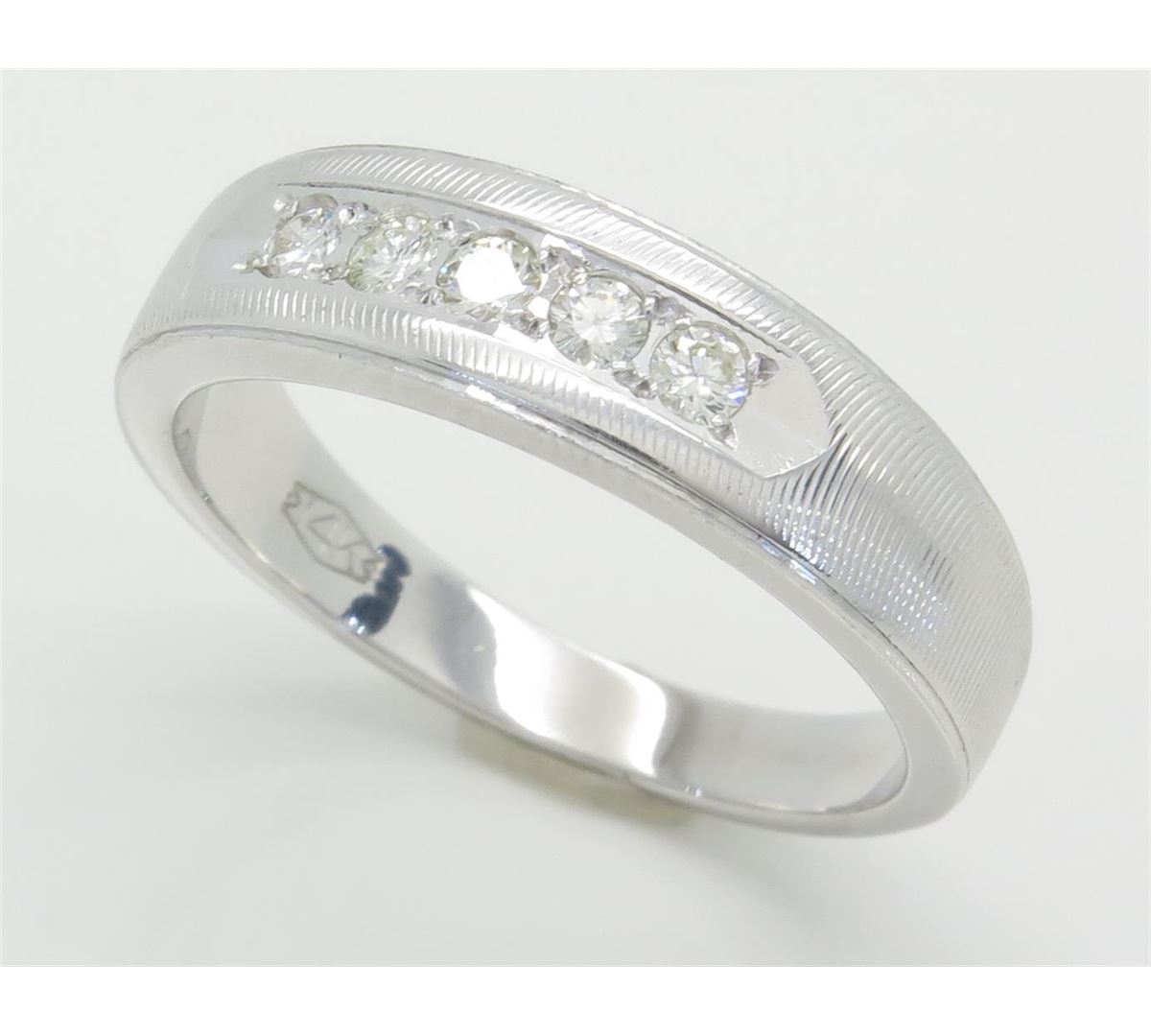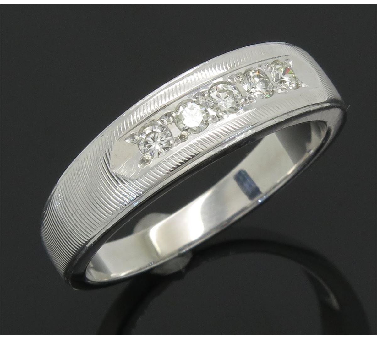 One tested 14K white gold mens diamond band. Containing: Five Round Brilliant Cut Diamonds. Clarity: I-SI, Color: H-I. Approximate total diamond weight: .25CTW. Diamonds are graded in the mounting, unless otherwise stated. Weight of ring: 6.5 grams. Size: 10.