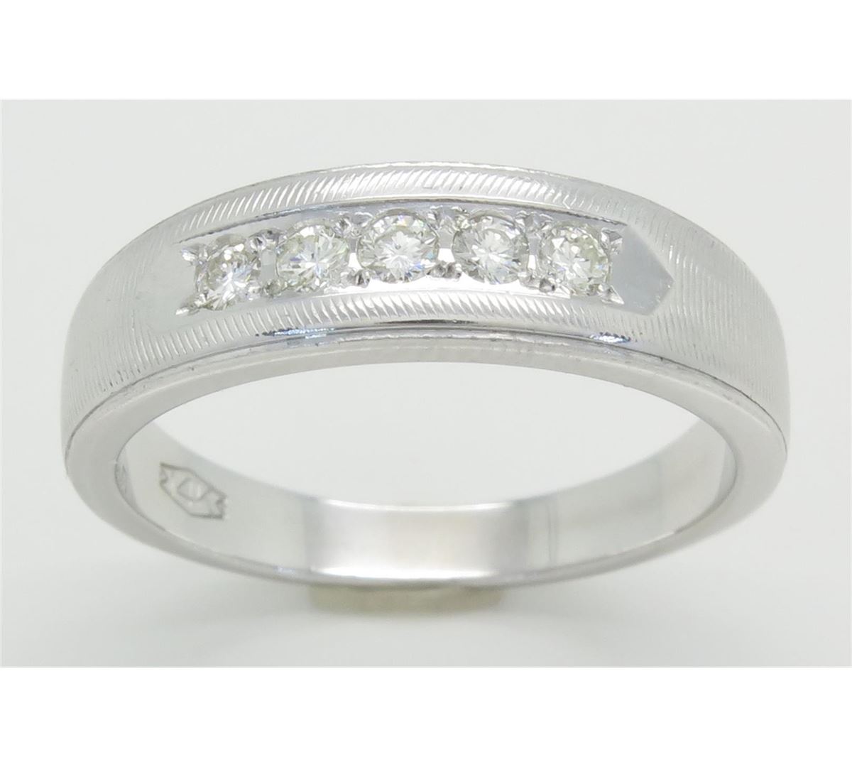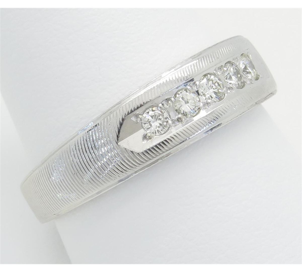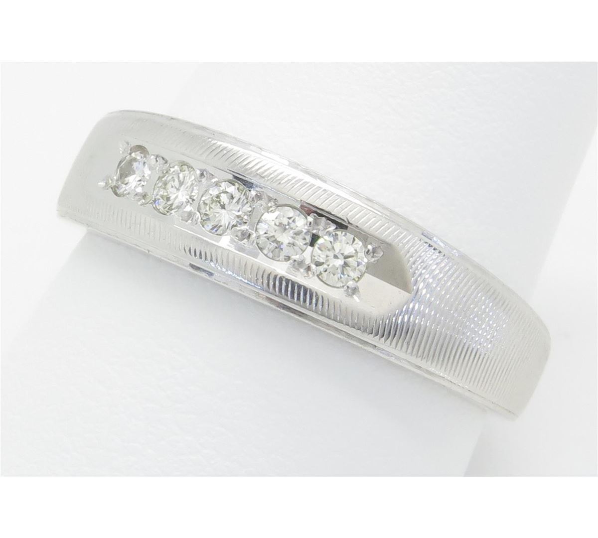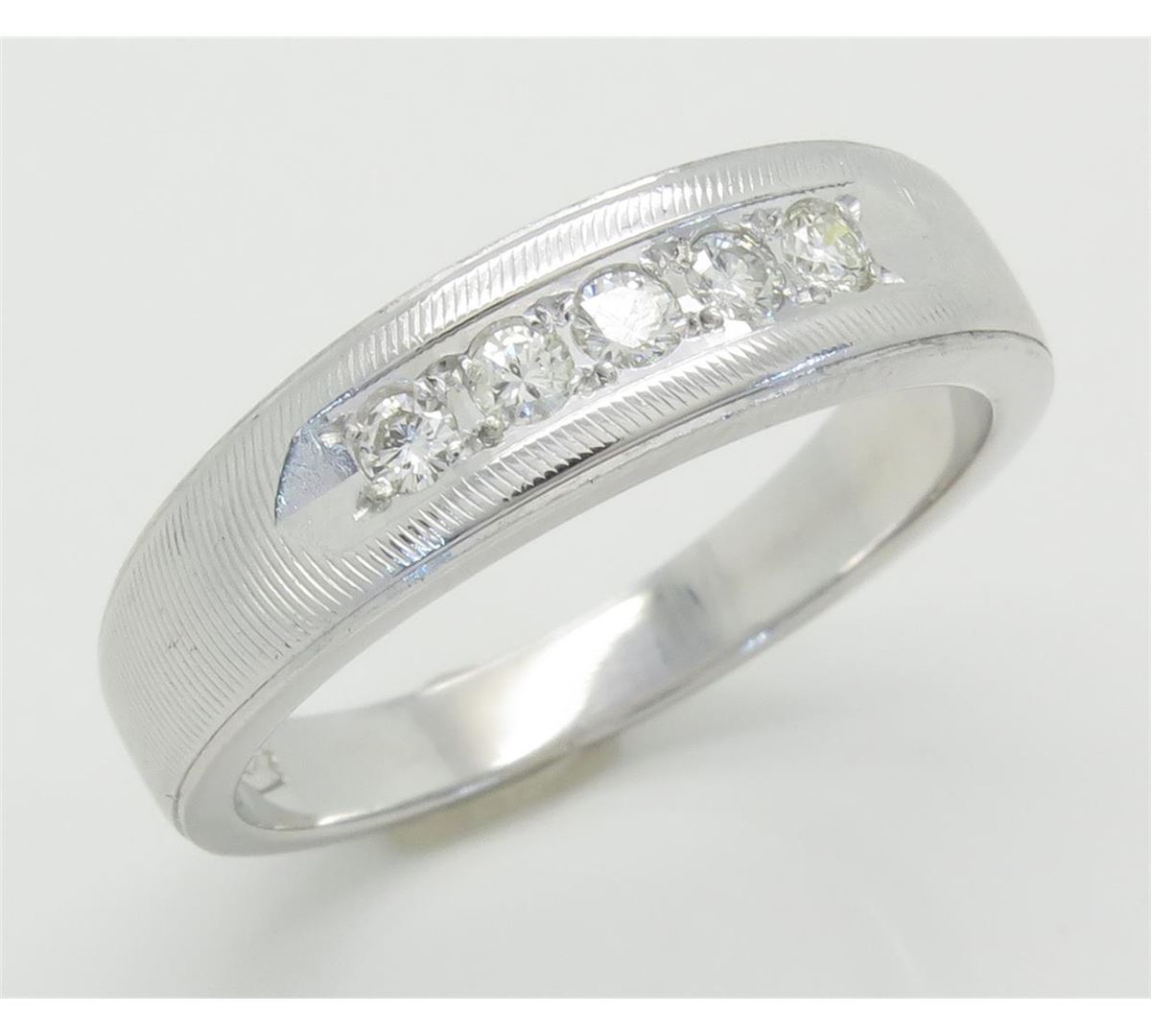 One tested 14K white gold mens diamond band. Containing: Five Round Brilliant Cut Diamonds. Clarity: I-SI, Color: H-I. Approximate total diamond weight: .25CTW. Diamonds are graded in the mounting, unless otherwise stated. Weight of ring: 6.5 grams. Size: 10.