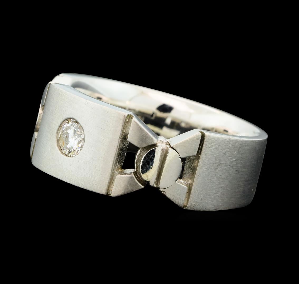 One electronically tested 18KT white gold man's cast wedding band with a bright polish and satin finish. The featured man's ring has a shank measuring 7.02 millimeters wide. Identified with markings of '18K'. Condition is new, good workmanship. Containing: One bezel set round brilliant cut diamond, measuring 4.15 - 4.10 x 2.50mm (depth est.) approximate weight of 0.26ct. Graded in the setting. Clarity I-1. Color: H - I Cut Good. Total Weight of Diamonds 0.26ct.. Total Weight of Band 16.90gm. GAS Appraised at $3,495.00.