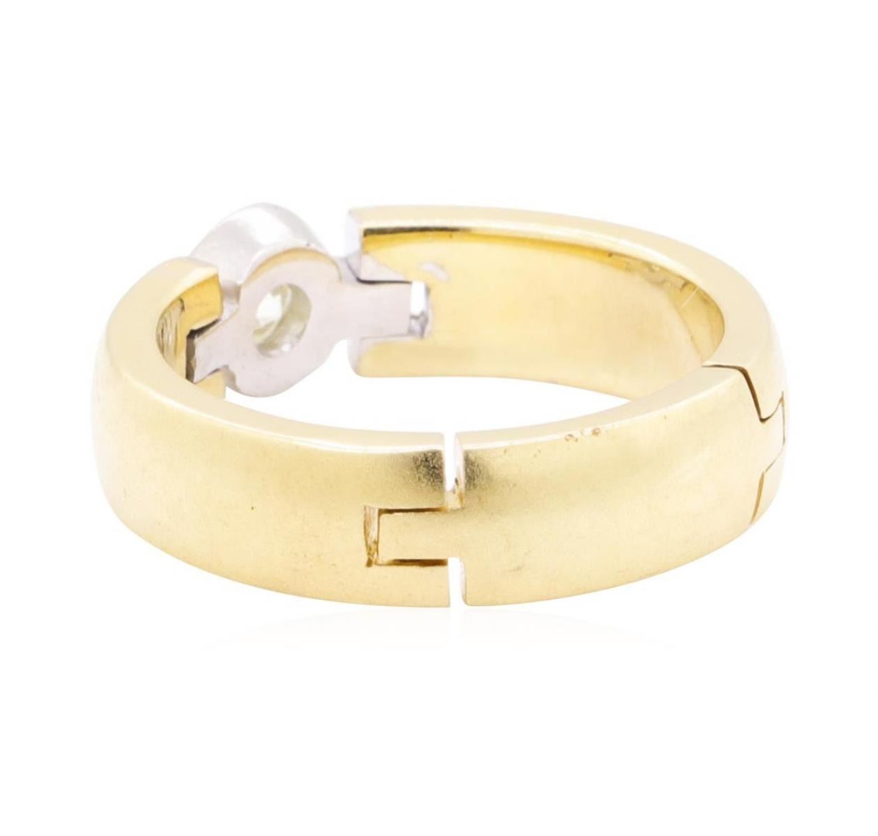 One electronically tested 14KT yellow and white gold lady's combination cast & assembled fashion hinged ring with a satin finish. The featured lady's ring has a hinged half dome shank measuring 5.10 millimeters wide. Identified with markings of '14K'. Condition is like new, good workmanship. Containing: One bezel set round brilliant cut diamond, measuring 4.30 - 4.28 x 2.32mm (depth est.) approximate weight of 0.26ct. Graded in the setting. Color K - L Clarity I-1 Cut Good. Total Weight of Diamonds 0.26ct.. Total Weight of Ring 7.00gm GAS Appraised at $1435.00. GAS Appraised.