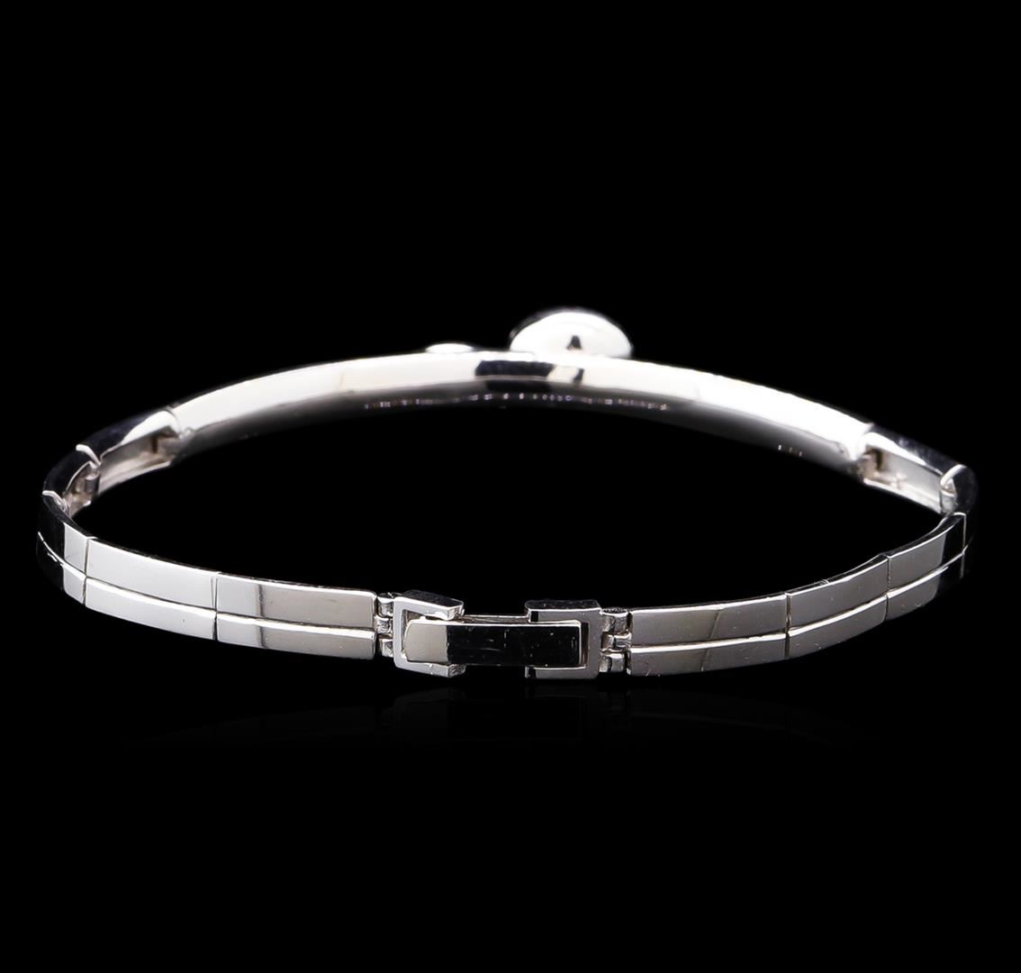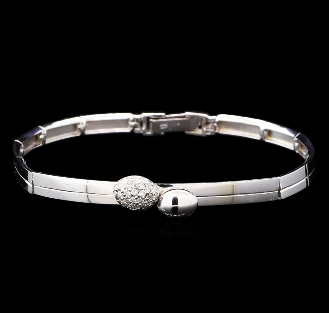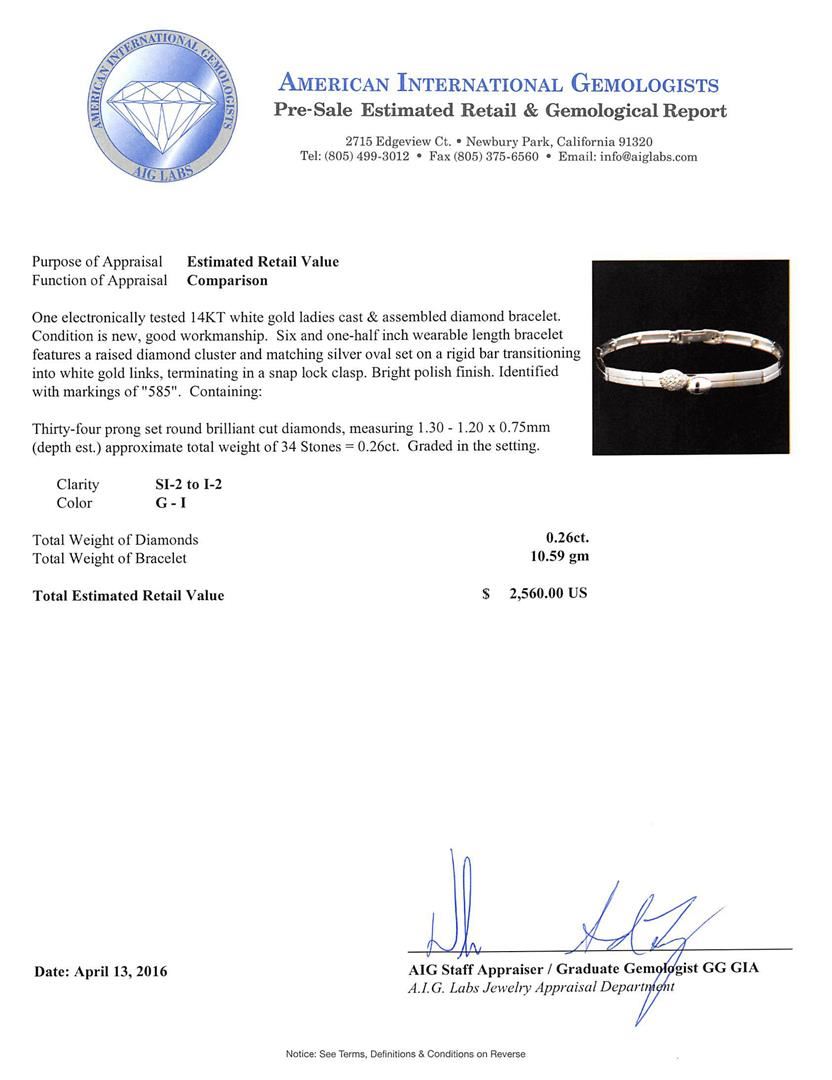 One electronically tested 14KT white gold ladies cast & assembled diamond bracelet. Six and one-half inch wearable length bracelet features a raised diamond cluster and matching silver oval set on a rigid bar transitioning into white gold links, terminating in a snap lock clasp. Bright polish finish. Identified with markings of "585". Condition is new, good workmanship. Containing: Thirty-Four prong set round brilliant cut diamonds, measuring 1.30 - 1.20 x 0.75mm (depth est.) approximate total weight of 34 Stones = 0.26ct. Graded in the setting. Clarity: SI-2 to I-2. Color: G - I. Total Weight of Diamonds 0.26ct. Total Weight of Bracelet 10.59gm. AIG Appraised at $2,560.00.