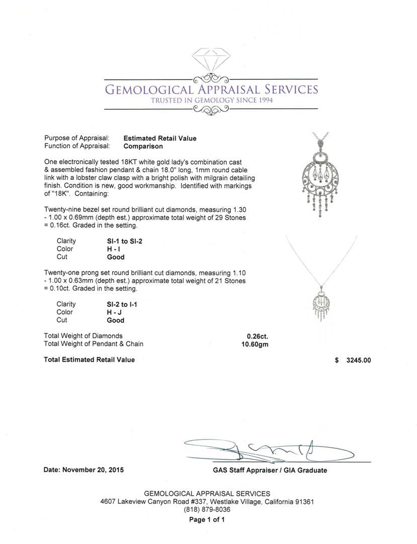 One electronically tested 18KT white gold lady's combination cast & assembled fashion pendant & chain 18.0" long, 1mm round cable link with a lobster claw clasp with a bright polish with milgrain detailing finish. Identified with markings of "18K". Condition is new, good workmanship. Containing: Twenty-Nine bezel set round brilliant cut diamonds, measuring 1.30 - 1.00 x 0.69mm (depth est.) approximate total weight of 29 Stones = 0.16ct. Graded in the setting. Clarity: SI-1 to SI-2. Color: H - I. Cut Good Twenty-One prong set round brilliant cut diamonds, measuring 1.10 - 1.00 x 0.63mm (depth est.) approximate total weight of 21 Stones = 0.10ct. Graded in the setting. Clarity: SI-2 to I-1. Color: H - Good. Total Weight of Diamonds 0.26ct. Total Weight of Pendant & Chain 10.60gm. GAS Appraised at $3,245.00.