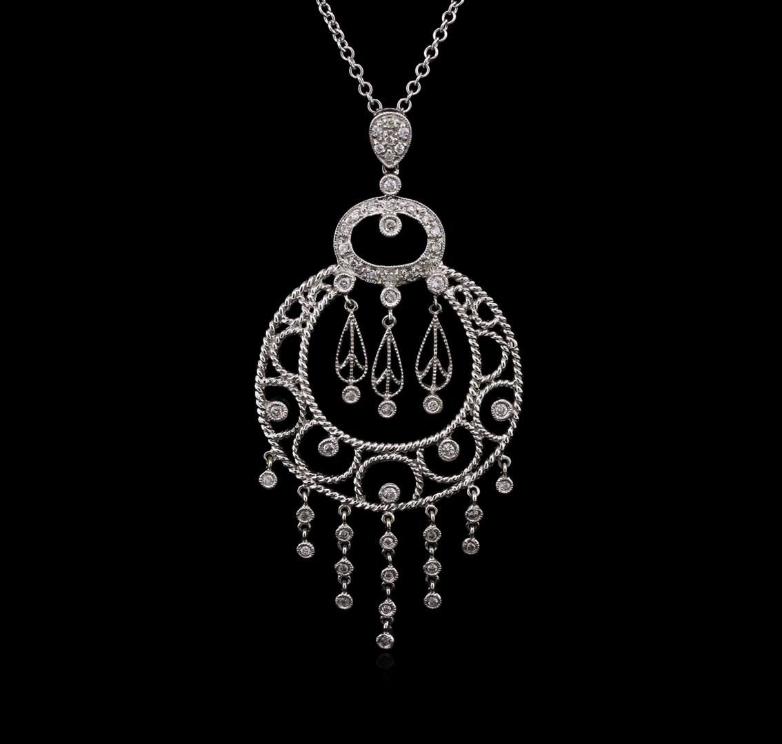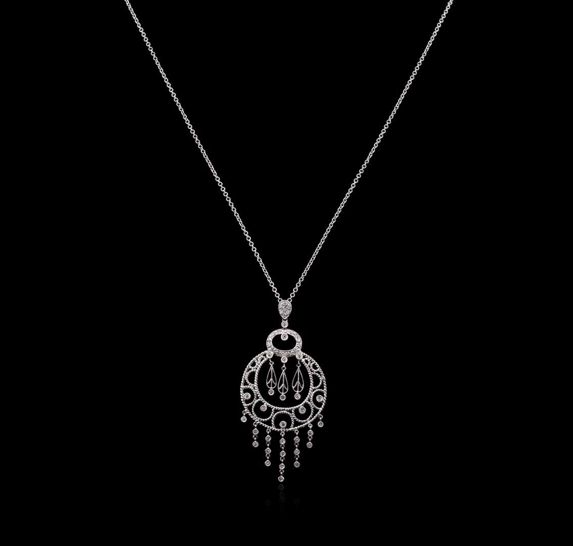 One electronically tested 18KT white gold lady's combination cast & assembled fashion pendant & chain 18.0" long, 1mm round cable link with a lobster claw clasp with a bright polish with milgrain detailing finish. Identified with markings of "18K". Condition is new, good workmanship. Containing: Twenty-Nine bezel set round brilliant cut diamonds, measuring 1.30 - 1.00 x 0.69mm (depth est.) approximate total weight of 29 Stones = 0.16ct. Graded in the setting. Clarity: SI-1 to SI-2. Color: H - I. Cut Good Twenty-One prong set round brilliant cut diamonds, measuring 1.10 - 1.00 x 0.63mm (depth est.) approximate total weight of 21 Stones = 0.10ct. Graded in the setting. Clarity: SI-2 to I-1. Color: H - Good. Total Weight of Diamonds 0.26ct. Total Weight of Pendant & Chain 10.60gm. GAS Appraised at $3,245.00.