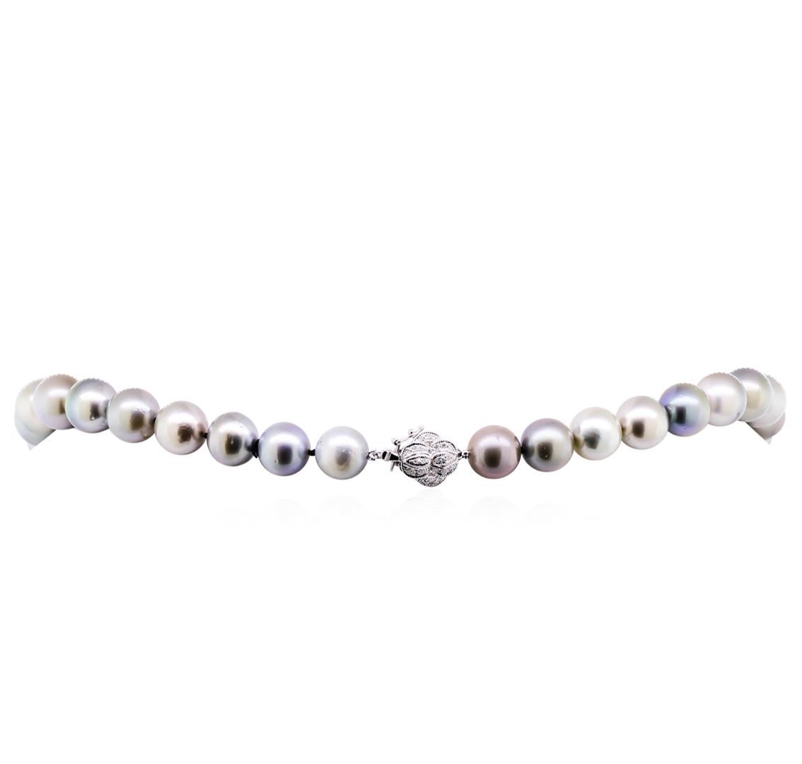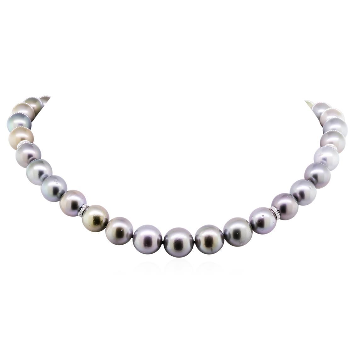 One graduated single strand pearl necklace 18.0" princess length, knotted with a tongue clasp & foldover safety containing 35 Tahitian pearls, 11.0mm in size to 14.1mm in size. The pearls are silver in color, green overtone with a very good luster, round to near round, and lightly blemished with good matching. Graded on the strand. Tahitian cultured pearls form in the Pinctada Margaritifera oysters. This species is native to the central and South Pacific Ocean but is generally raised in lagoons by pearl farmers. Tahitian cultured pearls take between two to four years to form. Sixty-Four prong set single cut diamonds, measuring 1.10 - 0.95 x 0.64mm (depth est.) approximate total weight of 64 Stones = 0.26ct. Graded in the setting. Clarity: SI-1 to I-1. Color: G - I. Cut Good. Total Weight of Diamonds 0.26ct. Total Weight of 97.00gm. GAS Appraised at $16,560.00.