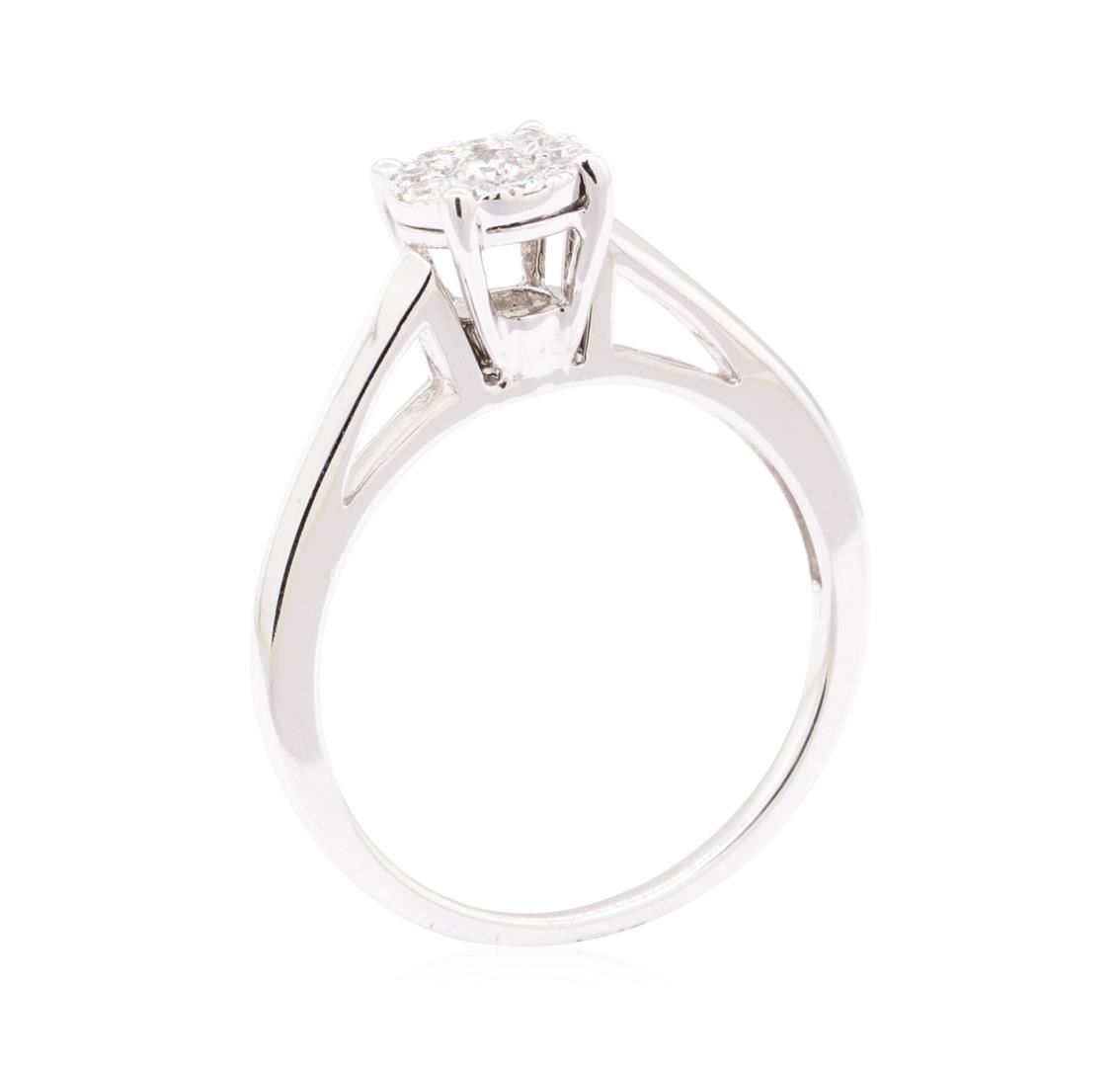 One electronically tested 14KT white gold lady's cast fashion ring with a cluster solitaire motif with a bright polish finish. The featured lady's ring has a knife edge cathedral shank measuring 1.50 millimeters wide. Identified with markings of '14K'. Condition is new, good workmanship. Containing: One prong set round brilliant cut diamond, measuring 3.00 - 2.95 x 1.85mm (depth est.) approximate weight of 0.10 ct. Graded in the setting. Color H Clarity I-1 Cut Very Good Nine prong set single cut diamonds, measuring 1.70 - 1.65 x 1.04mm (depth est.) approximate total weight of 9 Stones = 0.17ct. Graded in the setting. Color G - H Clarity VS-1 to VS-2 Cut Good. Total Weight of Diamonds 0.27ct.. Total Weight of Ring 2.80gm GAS Appraised at $935.00. GAS Appraised.