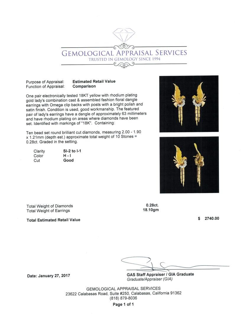 One pair electronically tested 18KT yellow with rhodium plating gold lady's combination cast & assembled fashion floral dangle earrings with Omega clip backs with posts with a bright polish and satin finish. The featured pair of lady's earrings have a dangle of approximately 63 millimeters and have rhodium plating on areas where diamonds have been set. Identified with markings of '18K'. Condition is used, good workmanship. Containing: Ten bead set round brilliant cut diamonds, measuring 2.00 - 1.90 x 1.21mm (depth est.) approximate total weight of 10 Stones = 0.28ct. Graded in the setting. Color H - I Clarity SI-2 to I-1 Cut Good. Total Weight of Diamonds 0.28ct.. Total Weight of Earrings 18.10gm. GAS Appraised.