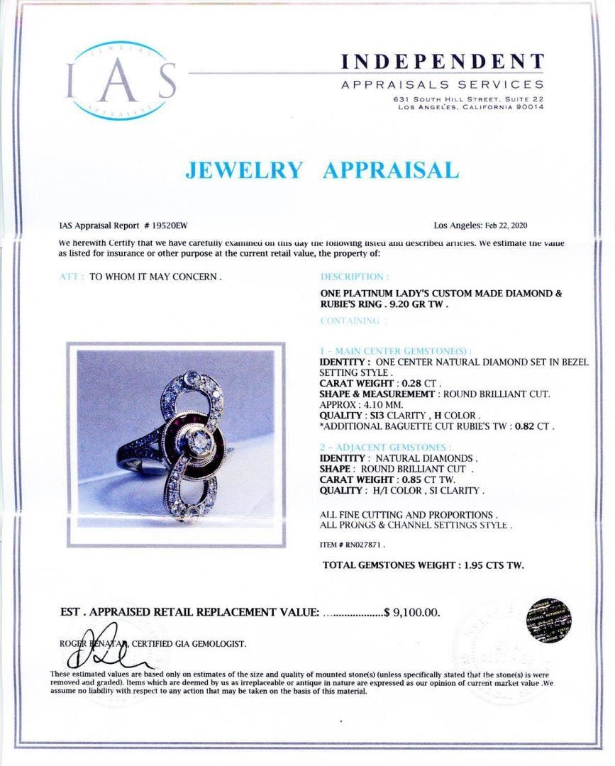 DESCRIPTION: ONE PLATINUM LADY'S CUSTOM MADE DIAMOND & RUBIES RING. 9.20 GR TW . CONTAINING : 1 - MAIN CENTER GEMSTONE(S) : IDENTITY : ONE CENTER NATURAL DIAMOND SET IN BEZEL SETTING STYLE. CARAT WEIGHT : 0.28CT. SHAPE & MEASUREMEMT : ROUND BRILLIANT CUT. APPROX : 4.10 MM. QUALITY : SI3 CLARITY, H COLOR . *ADDITIONAL BAGUETTE CUT RUBIES TW : 0.82CT. 2 â€" ADJACENT GEMSTONES : IDENTITY : NATURAL DIAMONDS. SHAPE : ROUND BRILLIANT CUT. CARAT WEIGHT : 0.85CT TW. QUALITY : H/I COLOR , SI CLARITY. ALL FINE CUTTING AND PROPORTIONS. ALL PRONGS & CHANNEL SETTINGS STYLE TOTAL GEMSTONES WEIGHT 1.95 CTS TW. Size: 6 1/4