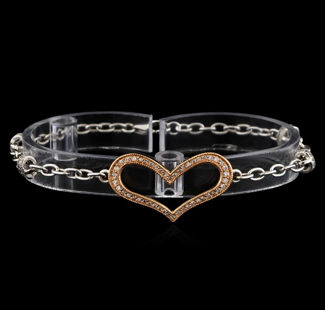One electronically tested 14KT white gold ladies cast & assembled diamond bracelet. Seven inch length bracelet features a diamond ribbon rose gold heart transitioning into white gold links with diamond rondelle stations, terminating in a lobster claw clasp. Bright and patterned finish with milgrain detailing and rose gold overlay. Identified with markings of "14K 585". Condition is new, good workmanship. Containing: Sixty prong set round brilliant cut diamonds, measuring 1.15 - 1.00 x 0.65mm (depth est.) approximate total weight of 60 Stones = 0.29ct. Graded in the setting. Clarity: SI-2 to I-2. Color: F - H. Total Weight of Diamonds 0.29ct. Total Weight of Bracelet 7.22gm. AIG Appraised at $2,340.00.