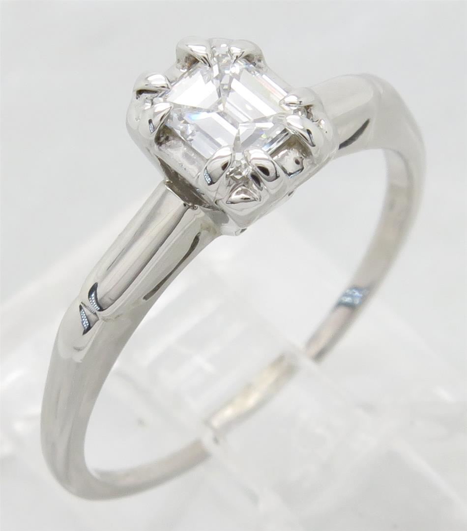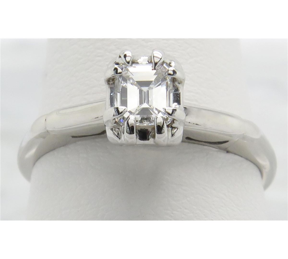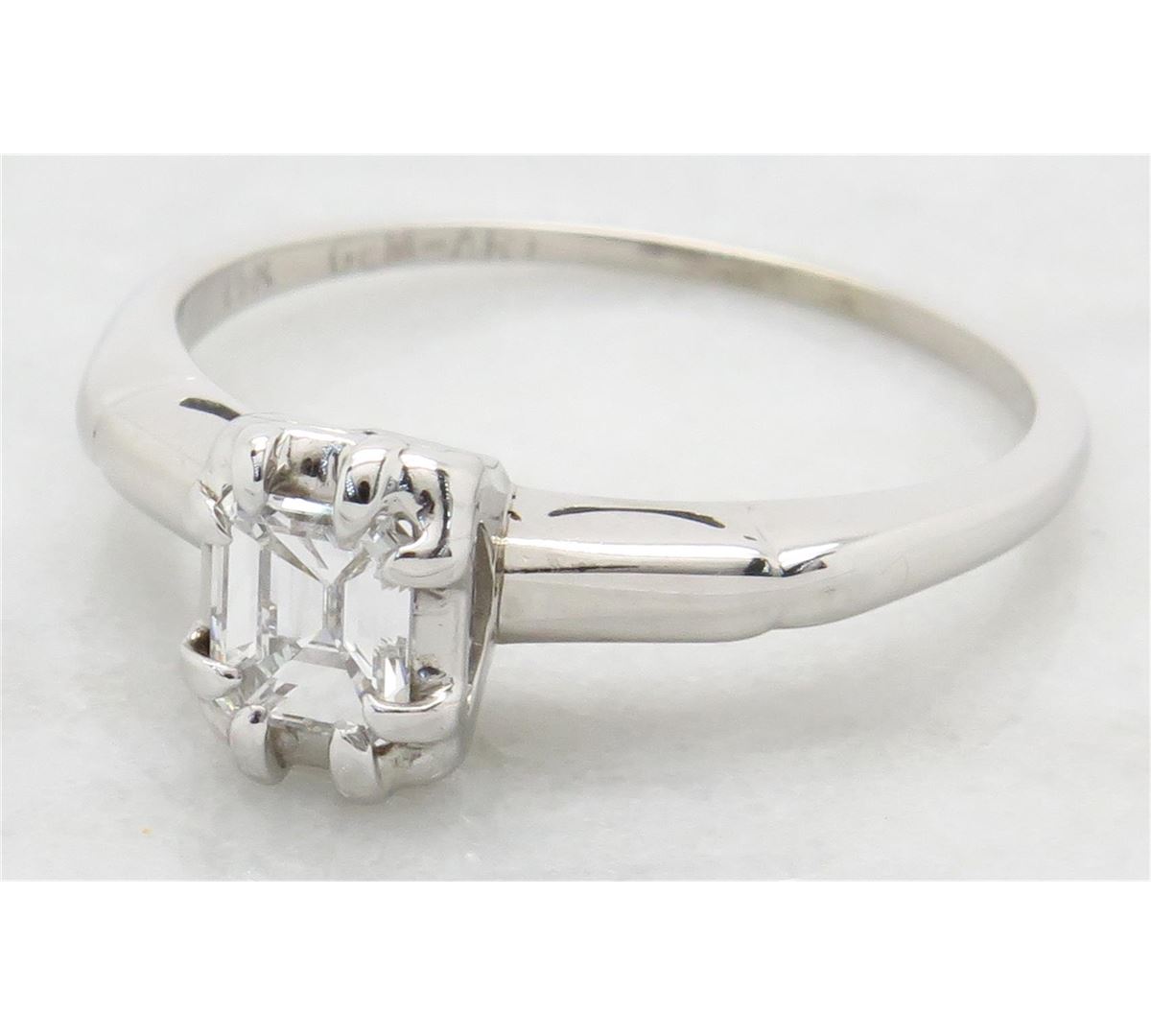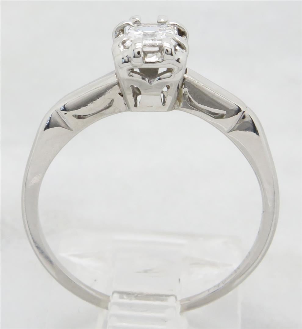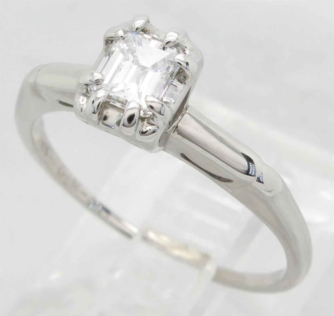 One tested 14K white gold diamond ring. Containing: One Emerald Cut Diamond. Approximate Size: .29CT, Clarity: VS2, Color: G-H. Diamonds are graded in the mounting, unless otherwise stated. Weight of ring: 2.0 grams. Size: 5.25