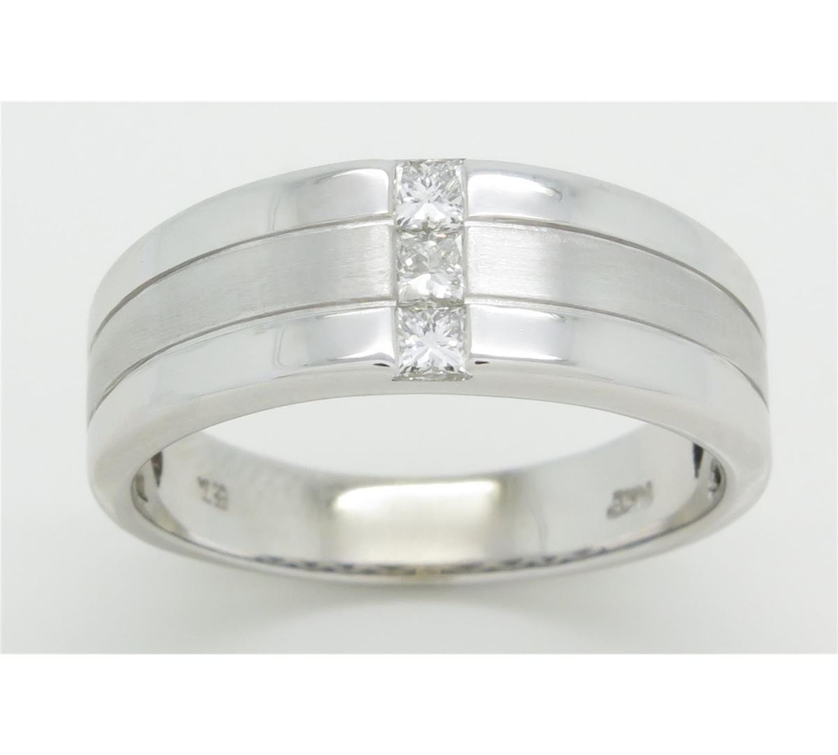 One tested 14K white gold mens diamond ring. Containing: 3 Princess Cut Diamonds. Clarity: I-SI, Color: G-H. Approximate total diamond weight: .30CTW. Diamonds are graded in the mounting, unless otherwise stated. Weight of ring: 6.2 grams. Size: 10.