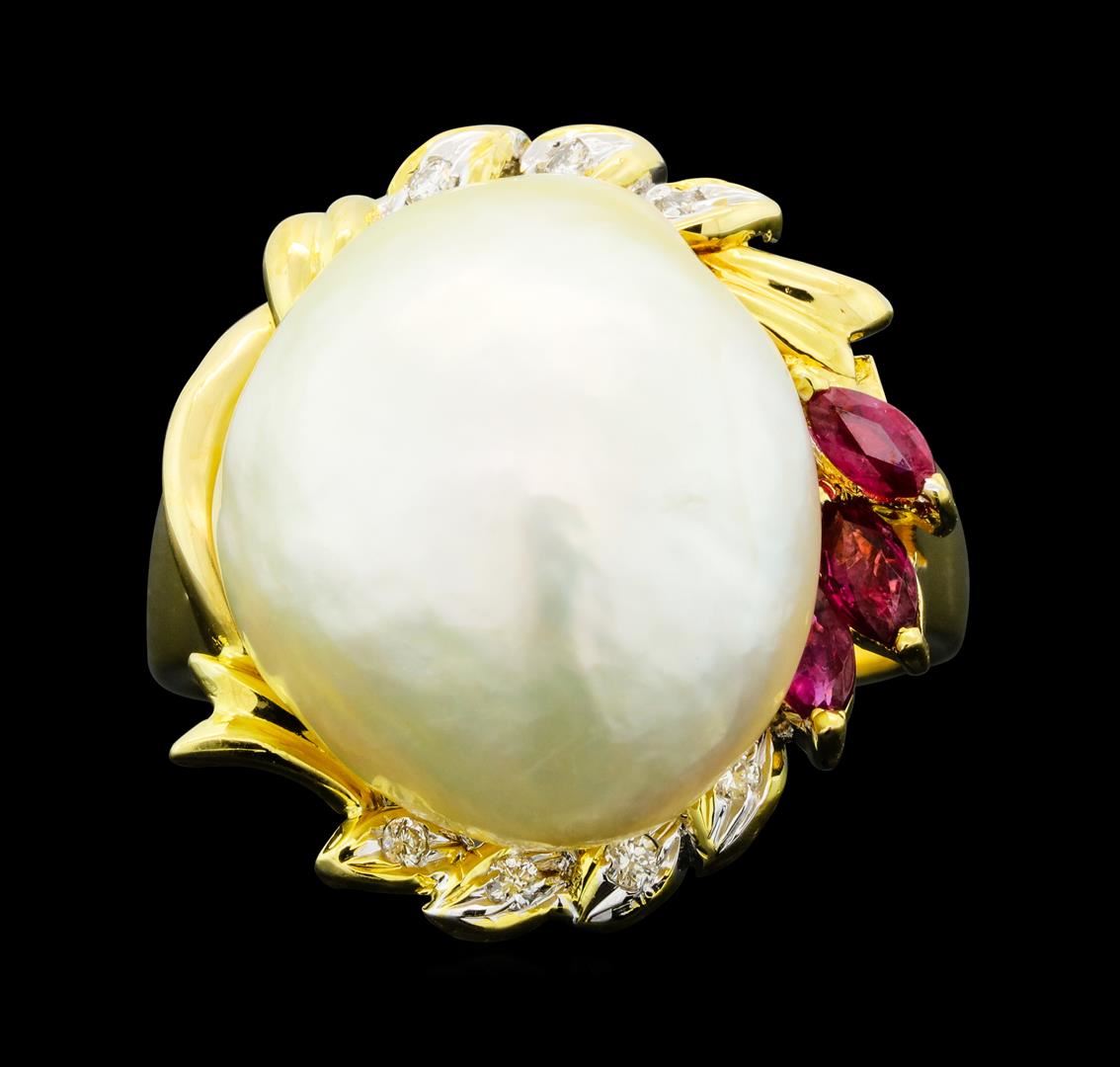 One ruby, pearl and diamond ring featuring: 18KT yellow gold weighing 13.14 grams containing one center pearl, rubies weighing 0.30ctw and diamonds weighing 0.05ctw.