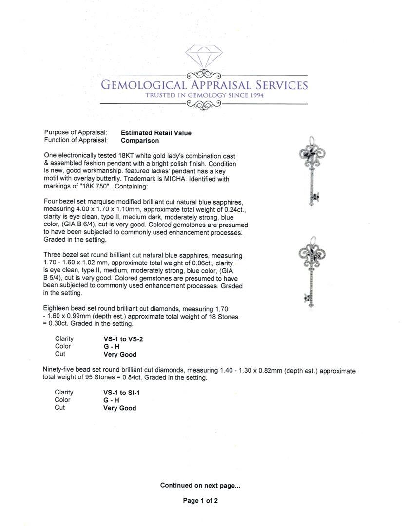 One electronically tested 18KT white gold lady's combination cast & assembled fashion pendant with a bright polish finish. featured ladies' pendant has a key motif with overlay butterfly. Trademark is MICHA. Identified with markings of "18K 750". Condition is new, good workmanship. Containing: Four bezel set marquise modified brilliant cut natural blue sapphires, measuring 4.00 x 1.70 x 1.10mm, approximate total weight of 0.24ct., clarity is eye clean, type II, medium dark, moderately strong, blue color, (GIA B 6/4), cut is very good. Colored gemstones are presumed to have been subjected to commonly used enhancement processes. Graded in the setting. Three bezel set round brilliant cut natural blue sapphires, measuring 1.70 - 1.60 x 1.02 mm, approximate total weight of 0.06ct., clarity is eye clean, type II, medium, moderately strong, blue color, (GIA B 5/4), cut is very good. Colored gemstones are presumed to have been subjected to commonly used enhancement processes. Graded in the setting. Eighteen bead set round brilliant cut diamonds, measuring 1.70 - 1.60 x 0.99mm (depth est.) approximate total weight of 18 Stones = 0.30ct. Graded in the setting. Clarity: VS-1 to VS-2. Color: G - Very Good Ninety-Five bead set round brilliant cut diamonds, measuring 1.40 - 1.30 x 0.82mm (depth est.) approximate total weight of 95 Stones = 0.84ct. Graded in the setting. Clarity: VS-1 to SI-1. Color: G - Very Good. Total Weight of Colored Stones 0.30ct. Total Weight of Diamonds 1.14ct. Total Weight of Pendant 6.40gm. GAS Appraised at $5,995.00.