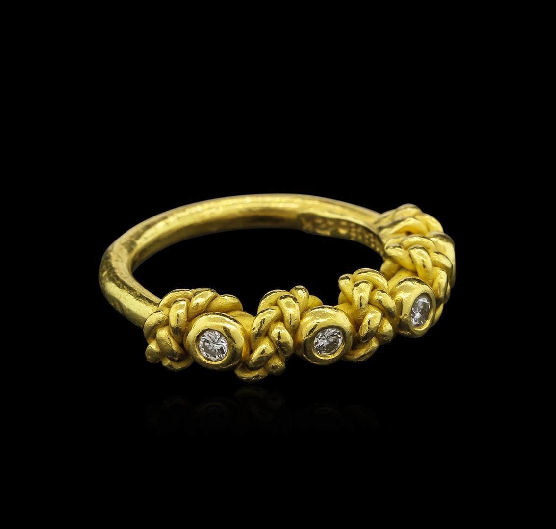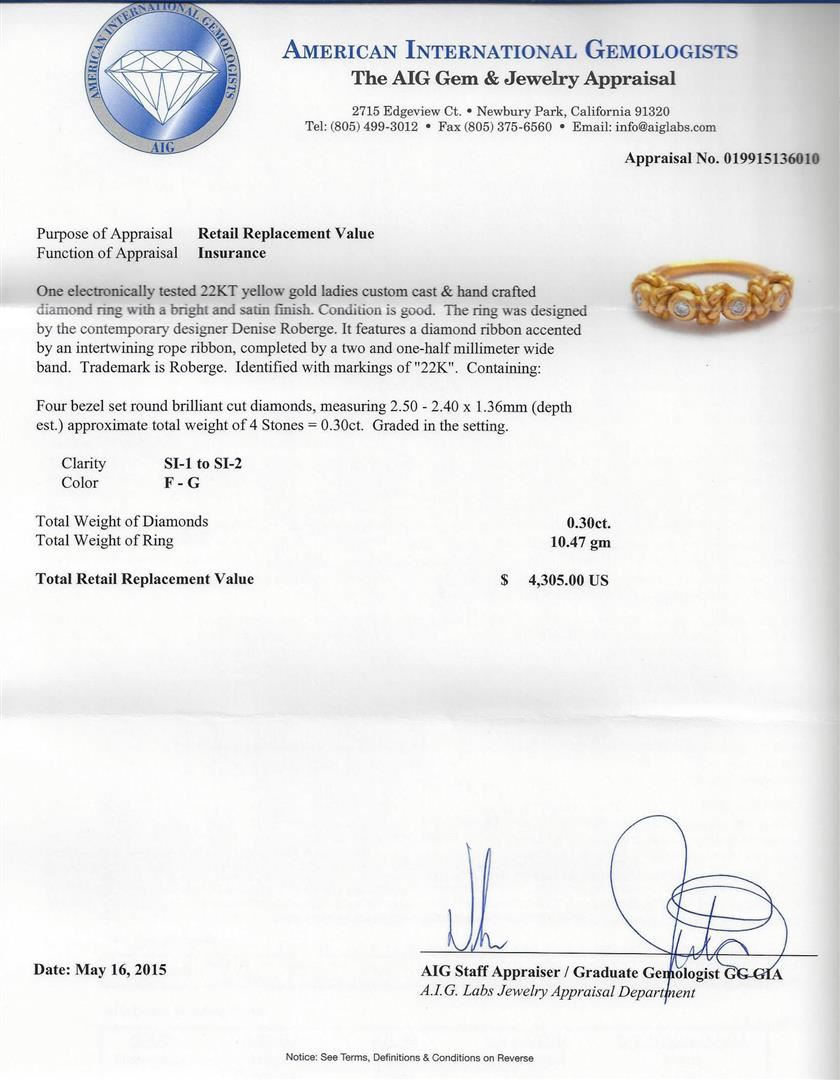 One electronically tested 22KT yellow gold ladies custom cast & hand crafted diamond ring with a bright and satin finish. Condition is good. The ring was designed by the contemporary designer Denise Roberge. It features a diamond ribbon accented by an intertwining rope ribbon, completed by a two and one-half millimeter wide band. Trademark is Roberge. Identified with markings of "22K". Containing: Four bezel set round brilliant cut diamonds, measuring 2.50 - 2.40 x 1.36mm (depth est.) approximate total weight of 4 Stones = 0.30ct. Graded in the setting. Clarity: SI-1 to SI-2. Color: F - G. Total Weight of Diamonds: 0.30ct. Total Weight of Ring: 10.47 gm. AIG Appraised at $4,305.00.