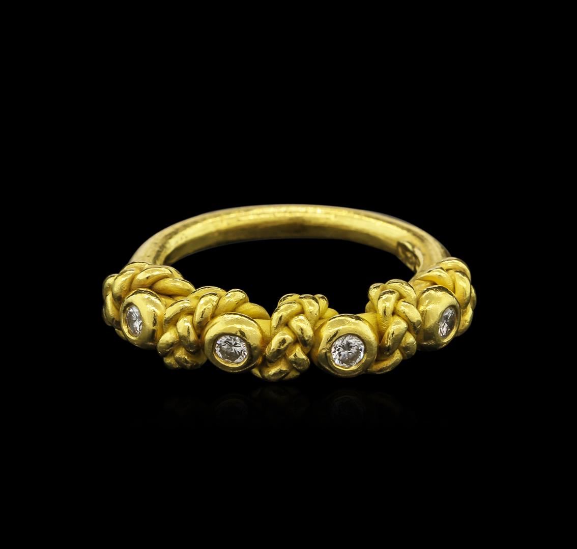 One electronically tested 22KT yellow gold ladies custom cast & hand crafted diamond ring with a bright and satin finish. Condition is good. The ring was designed by the contemporary designer Denise Roberge. It features a diamond ribbon accented by an intertwining rope ribbon, completed by a two and one-half millimeter wide band. Trademark is Roberge. Identified with markings of "22K". Containing: Four bezel set round brilliant cut diamonds, measuring 2.50 - 2.40 x 1.36mm (depth est.) approximate total weight of 4 Stones = 0.30ct. Graded in the setting. Clarity: SI-1 to SI-2. Color: F - G. Total Weight of Diamonds: 0.30ct. Total Weight of Ring: 10.47 gm. AIG Appraised at $4,305.00.