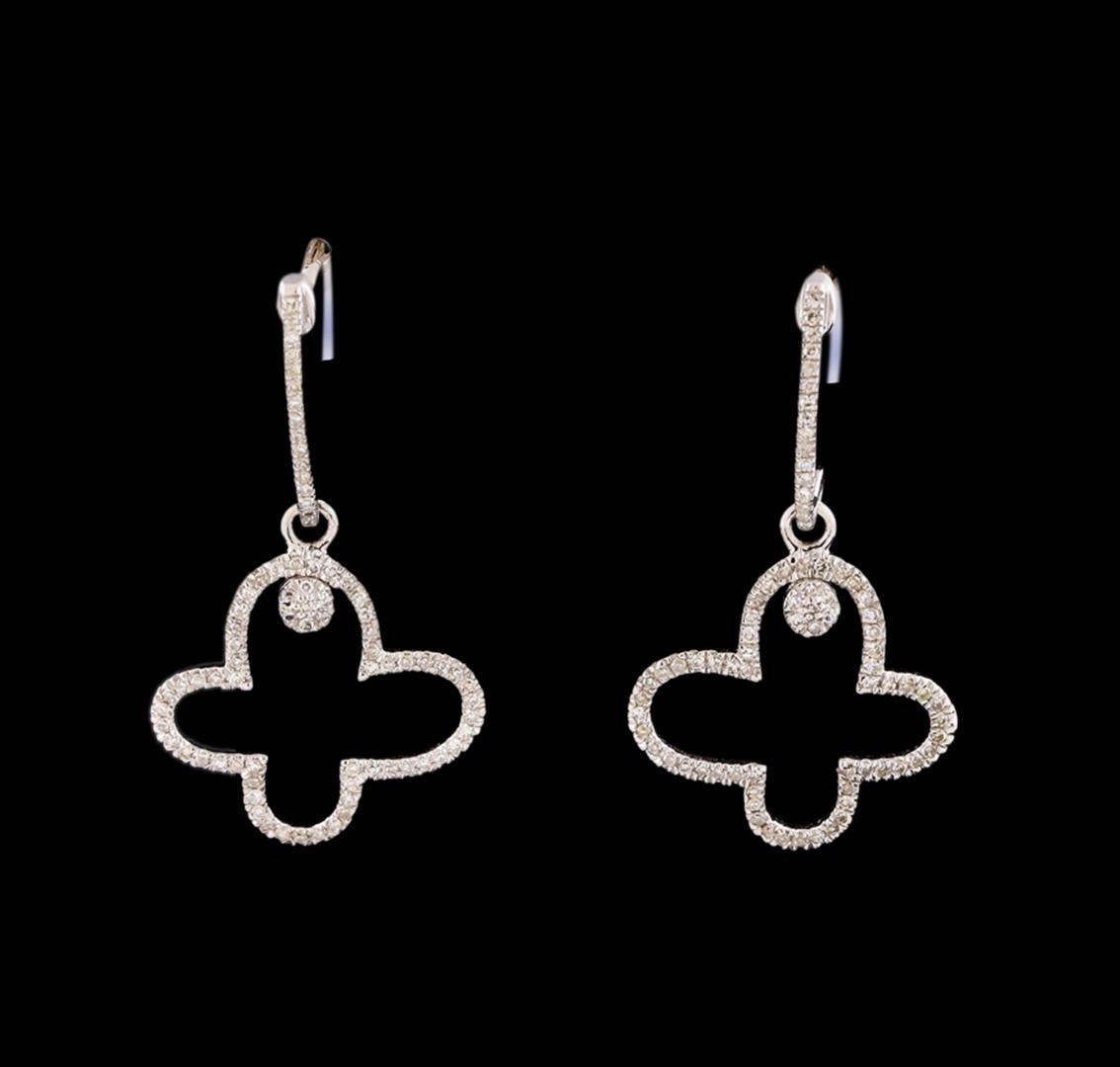 One pair electronically tested 14KT white gold lady's cast fashion dangle earrings with friction posts with a bright polish finish. The featured lady's earrings have a dangle measuring 30 millimeters in length. Identified with markings of '14K'. Condition is new, good workmanship. Containing: One Hundred Fifty-Eight prong set single cut diamonds, measuring 0.85 - 0.80 x 0.50mm (depth est.) approximate total weight of 158 Stones = 0.31ct. Graded in the setting. Clarity SI-2 to I-1. Color: H - I Cut Good. Total Weight of Diamonds 0.31ct.. Total Weight of Earrings 2.20gm. GAS Appraised at $1,850.00.