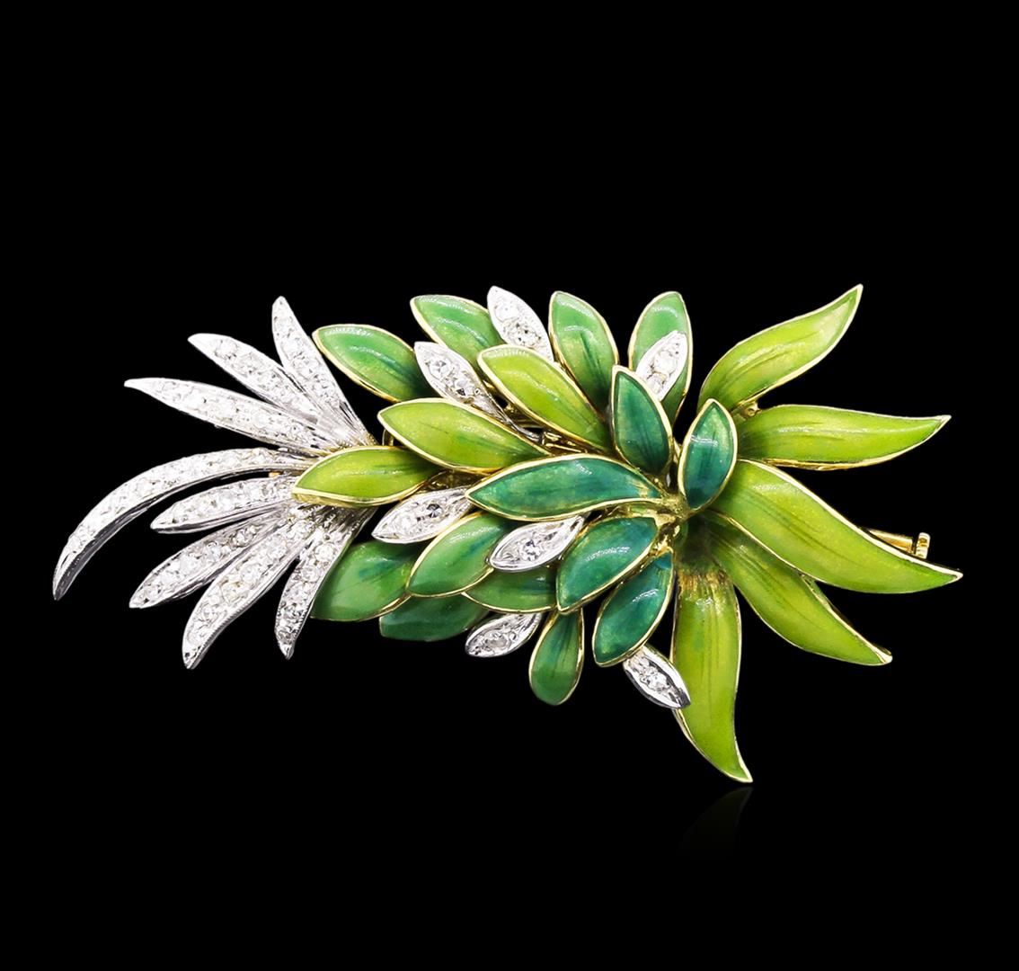 One electronically tested 18KT white and yellow gold lady's combination cast & assembled fashion vintage pin with a bright polish with milgrain detailing finish. The featured pin has a floral motif with green to yellowish green enameled leafs. Identified with markings of "750". Condition is used, good workmanship. Containing: Fifty-Two bead set single cut diamonds, measuring 1.30 - 1.05 x 0.71mm (depth est.) approximate. Total Weight of 52 Stones = 0.31ct. Graded in the setting. Clarity: VS-2 to SI-1. Color: G - Very Good. Total Weight of Diamonds 0.31ct. Total Weight of Vintage Pin 17.70gm. GAS Appraised.