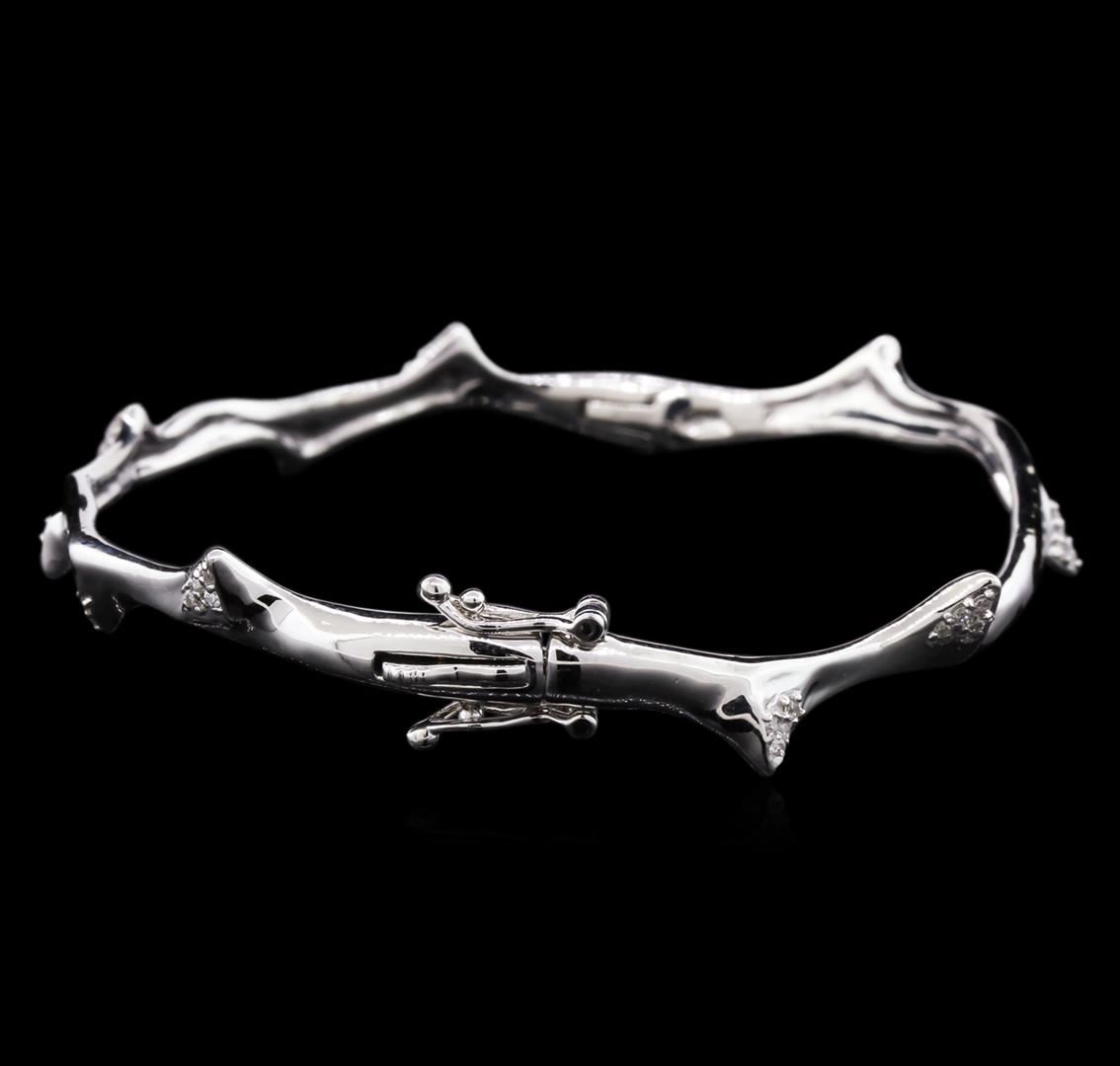 One electronically tested 14KT white gold lady's combination cast & assembled fashion bangle bracelet with a concealed clasp with foldover safety with a bright polish finish. The featured lady's bangle bracelet has a twisted spiked branch motif and measures approximately 6.75 inches in length. Identified with markings of "585". Condition is new, good workmanship. Containing: Forty-Four prong set round brilliant cut diamonds, measuring 1.30 - 1.20 x 0.76mm (depth est.) approximate total weight of 44 Stones = 0.32ct. Graded in the setting. Clarity: SI-1 to SI-2. Color: H - I. Cut Good. Total Weight of Diamonds 0.32ct. Total Weight of Bangle Bracelet 14.50gm. GAS Appraised.