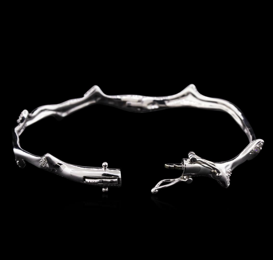 One electronically tested 14KT white gold lady's combination cast & assembled fashion bangle bracelet with a concealed clasp with foldover safety with a bright polish finish. The featured lady's bangle bracelet has a twisted spiked branch motif and measures approximately 6.75 inches in length. Identified with markings of "585". Condition is new, good workmanship. Containing: Forty-Four prong set round brilliant cut diamonds, measuring 1.30 - 1.20 x 0.76mm (depth est.) approximate total weight of 44 Stones = 0.32ct. Graded in the setting. Clarity: SI-1 to SI-2. Color: H - I. Cut Good. Total Weight of Diamonds 0.32ct. Total Weight of Bangle Bracelet 14.50gm. GAS Appraised.