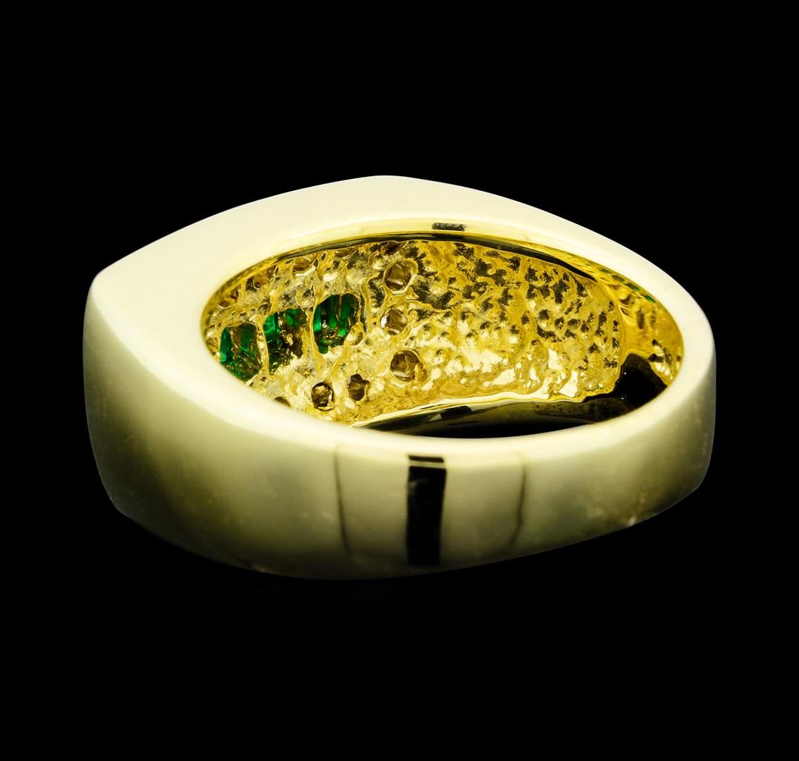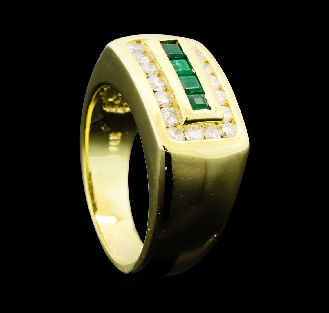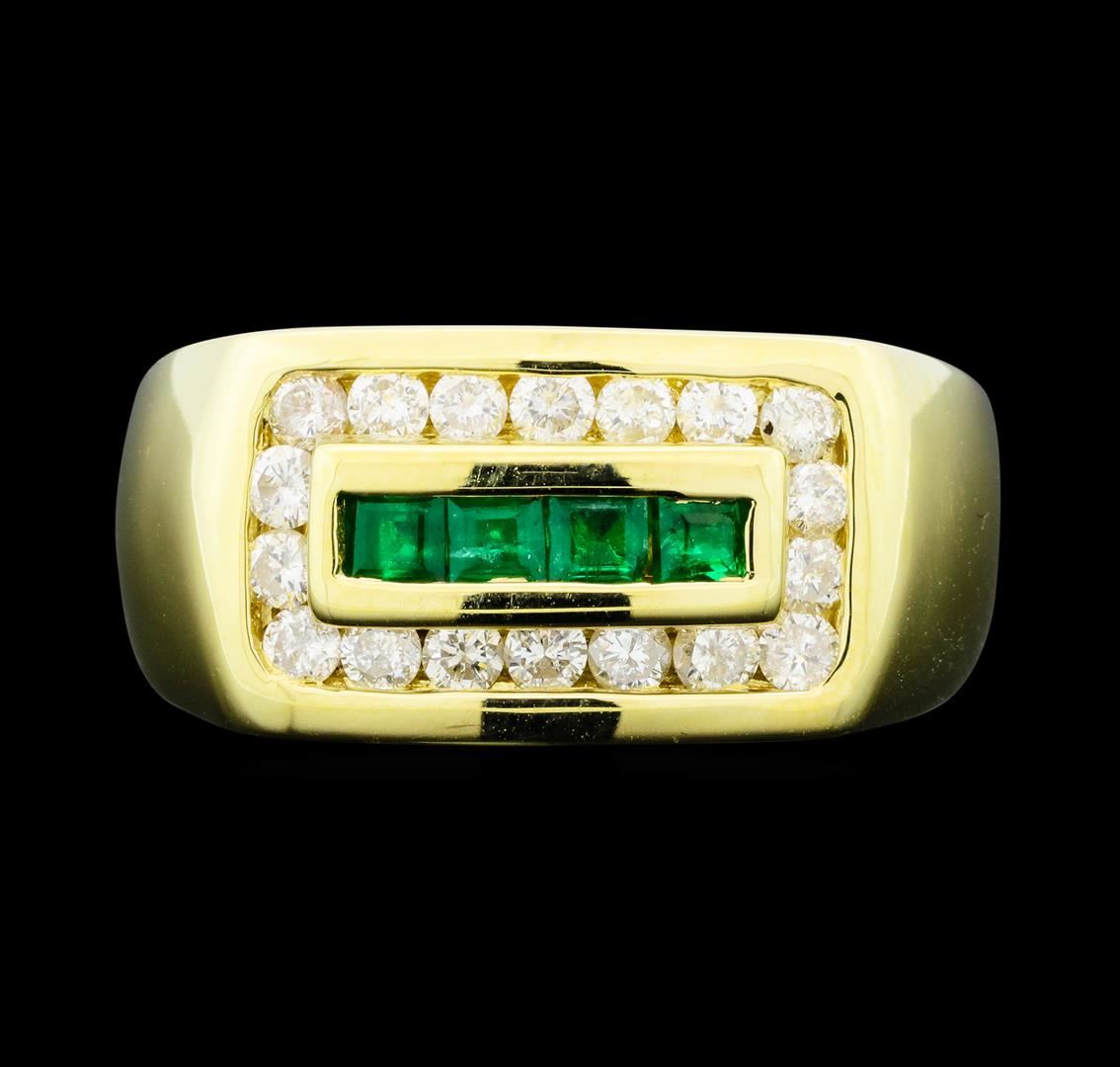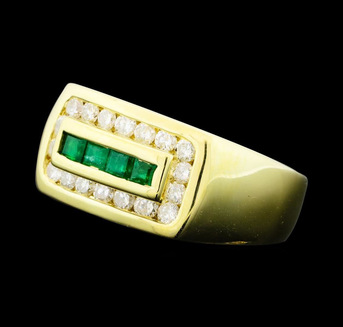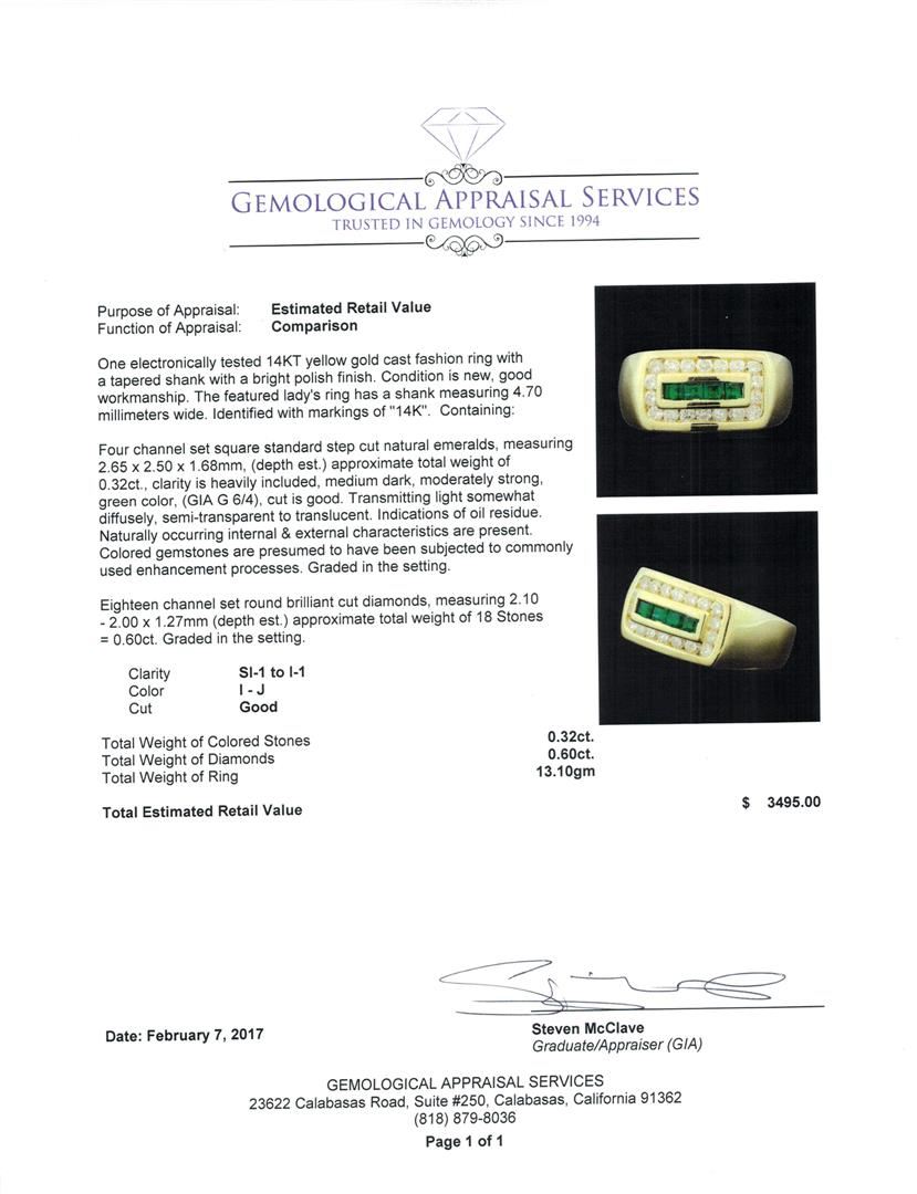 One electronically tested 14KT yellow gold cast fashion ring with a tapered shank with a bright polish finish. The featured lady's ring has a shank measuring 4.70 millimeters wide. Identified with markings of '14K'. Condition is new, good workmanship. Containing: Four channel set square standard step cut natural emeralds, measuring 2.65 x 2.50 x 1.68mm, (depth est.) approximate total weight of 0.32ct., clarity is heavily included, medium dark, moderately strong, green color, (GIA G 6/4), cut is good. Transmitting light somewhat diffusely, semi-transparent to translucent. Indications of oil residue. Naturally occurring internal & external characteristics are present. Colored gemstones are presumed to have been subjected to commonly used enhancement processes. Graded in the setting. Eighteen channel set round brilliant cut diamonds, measuring 2.10 - 2.00 x 1.27mm (depth est.) approximate total weight of 18 Stones = 0.60ct. Graded in the setting. Clarity SI-1 to I-1. Color: I - J Cut Good. Total Weight of Colored Stones 0.32ct.. Total Weight of Diamonds 0.60ct.. Total Weight of Ring 13.10gm GAS Appraised at $3,495.00.