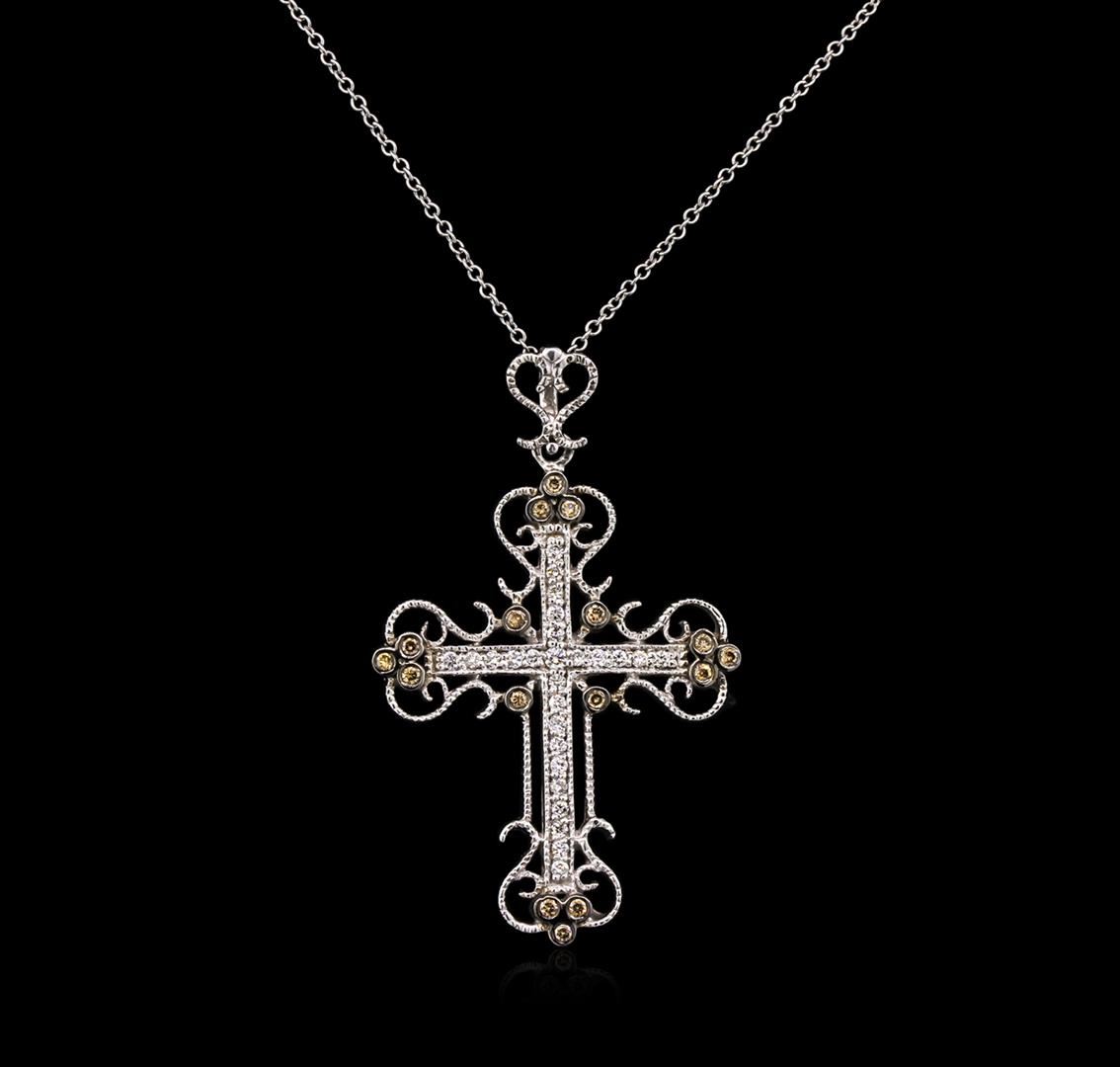 One cross pendant with chain featuring: 14KT white gold weighing 6.00 grams containing white and brown diamonds with a total approximate weight of 0.32ct.