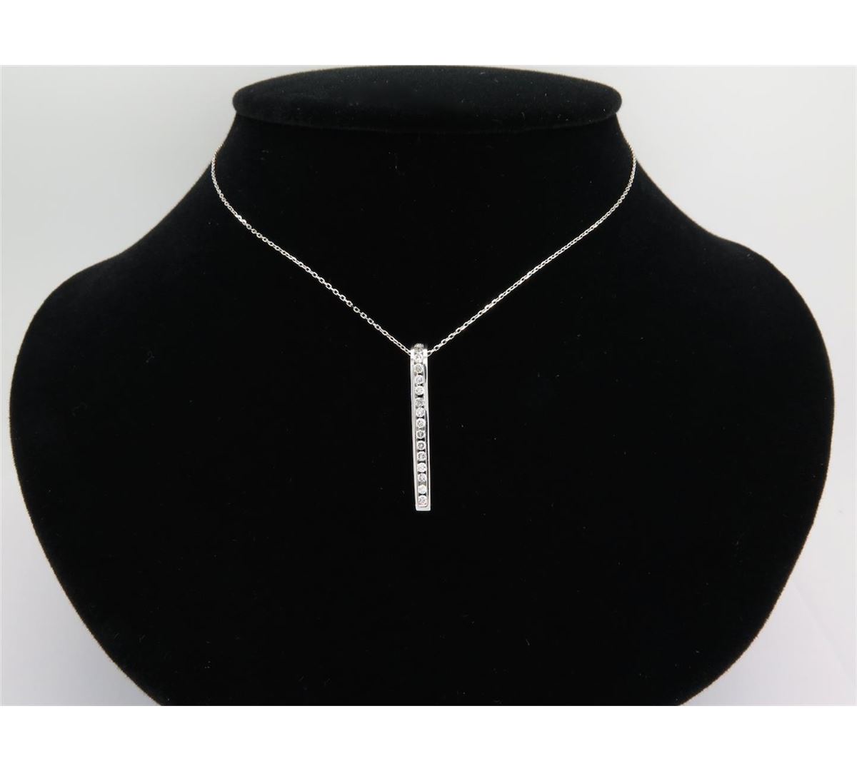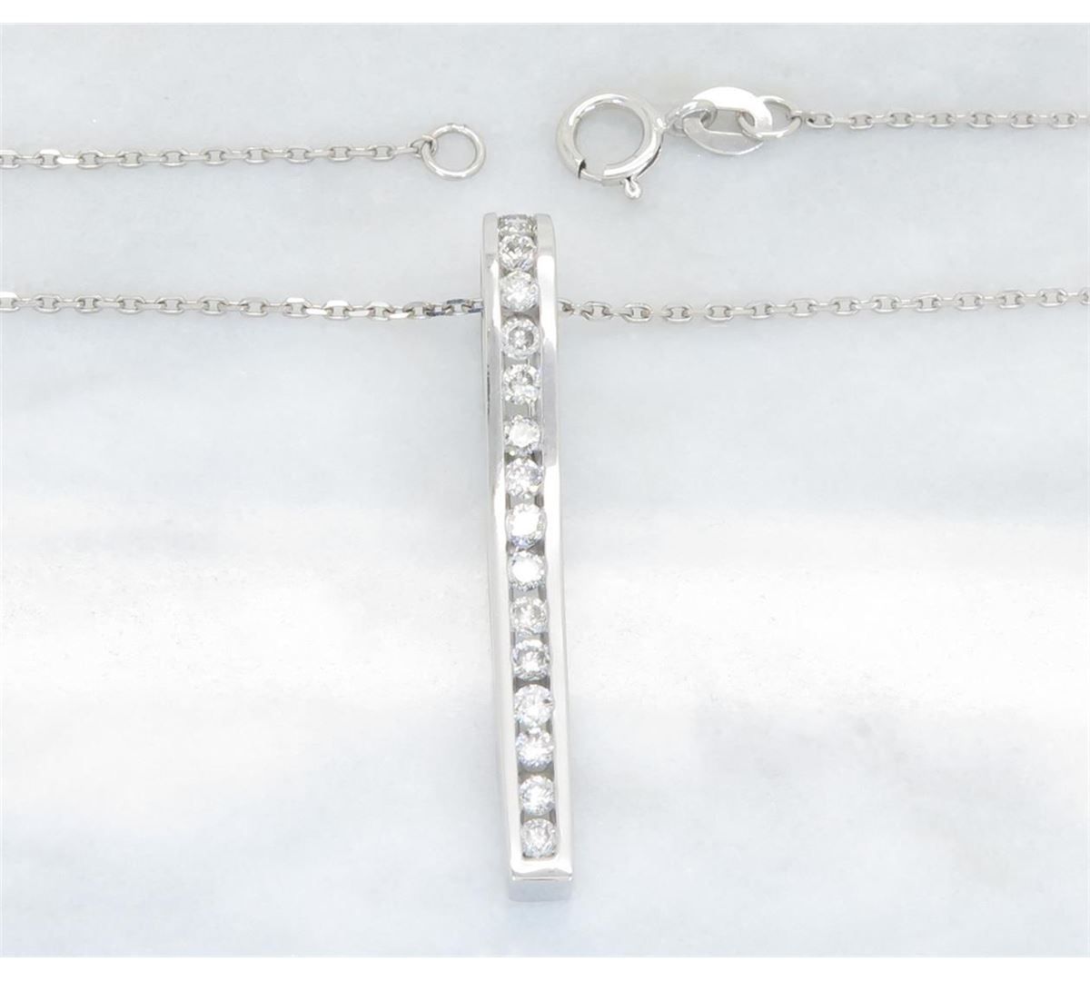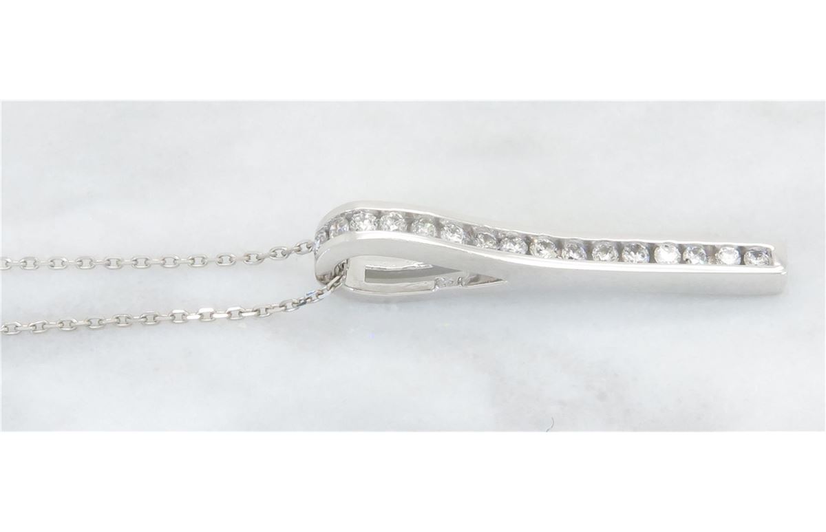 One tested 14K white gold diamond pendant. Containing: 16 Round Brilliant Cut Diamonds. Clarity: I, Color: G-H. Approximate total diamond weight: .32CTW. All diamonds are graded in the mounting unless otherwise stated. Weight of necklace: 3.5 grams, Size of chain: 16" long.