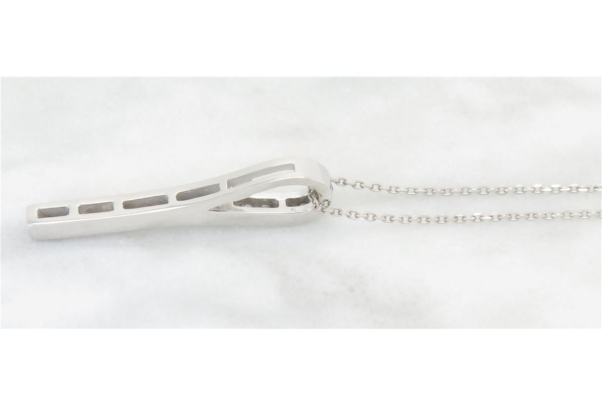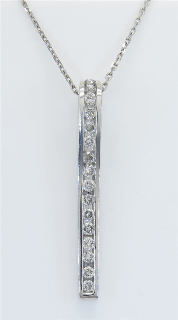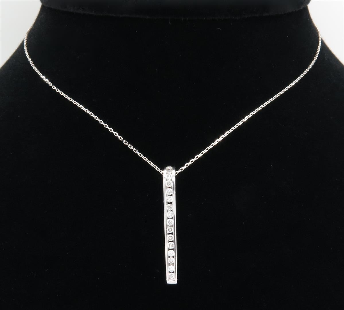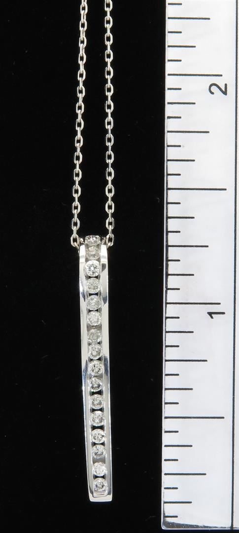 One tested 14K white gold diamond pendant. Containing: 16 Round Brilliant Cut Diamonds. Clarity: I, Color: G-H. Approximate total diamond weight: .32CTW. All diamonds are graded in the mounting unless otherwise stated. Weight of necklace: 3.5 grams, Size of chain: 16" long.