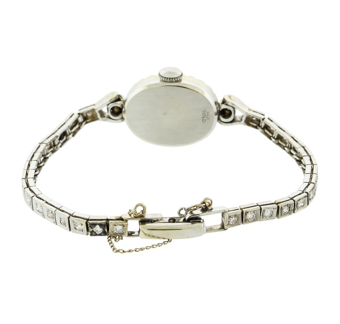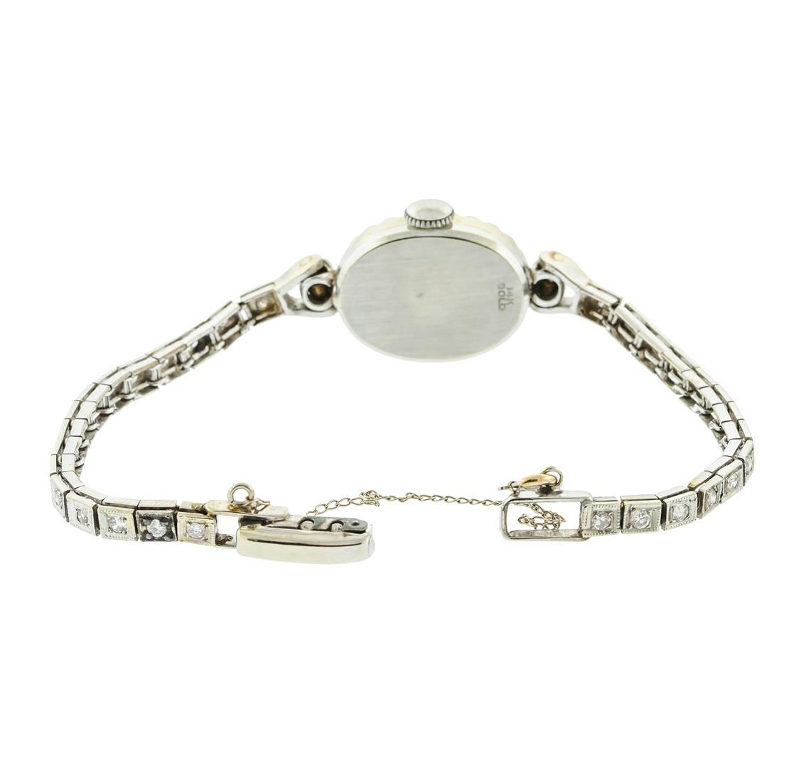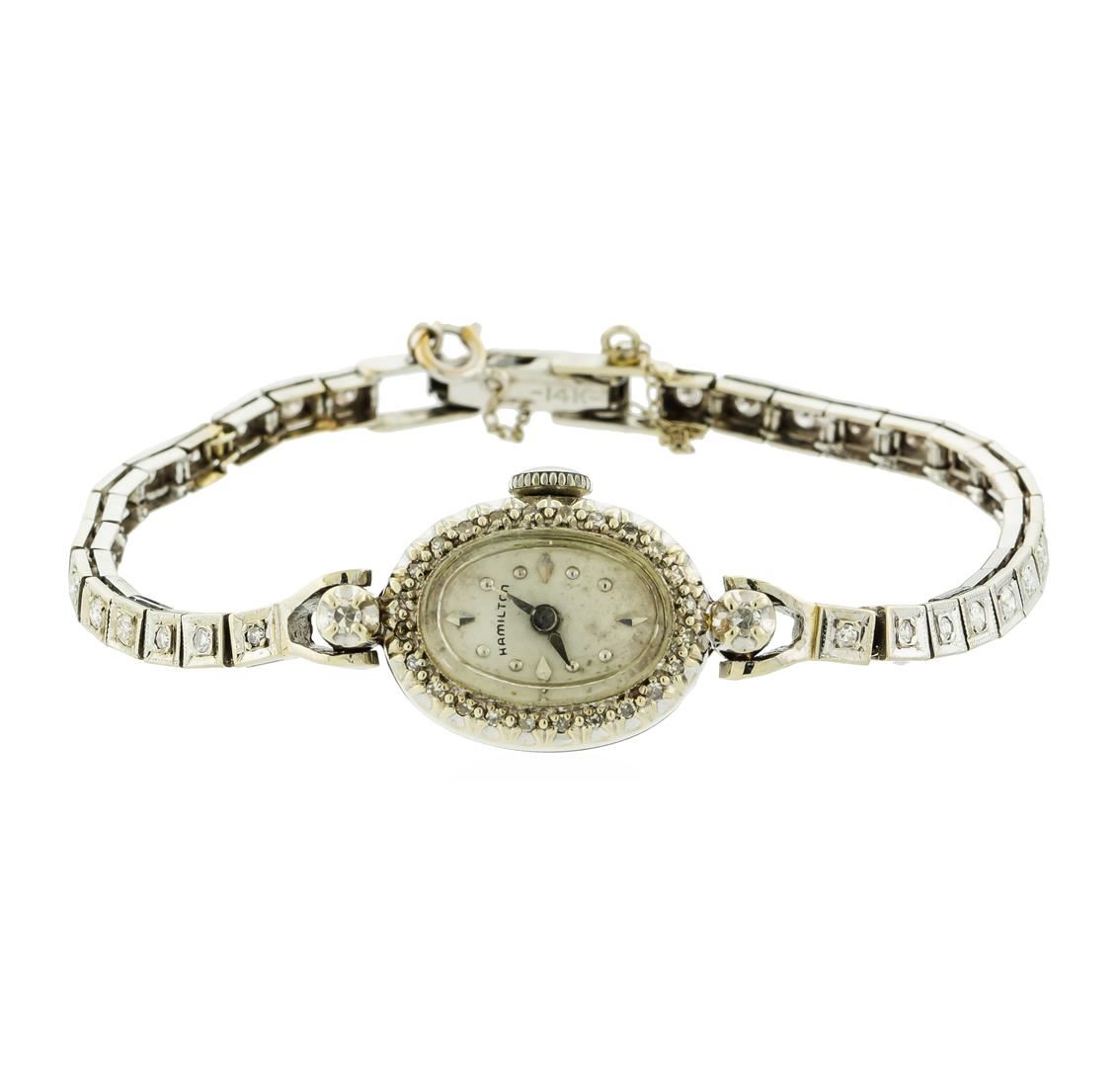 One cast manufactured 14KT White Gold Hamilton Diamond Art Deco Ladies Wristwatch with Mechanical Movement. Case and Lugs: 14KT White Gold, diamond bezel, acrylic crystal, measures 19mm x 15mm. Signed "14K". Dial: White in color with round markers and pointed hands. Bracelet: 14KT White Gold set with diamonds, fold over clasp with safety chain. Signed: "14K". Condition: G-4 FINE, (good working order and good condition). Containing: Fifty-Seven prong set single cut diamonds, measuring 1.30 - 1.10 x 0.66mm (depth est.) approximate total weight of 57 Stones = 0.33ct. Clarity of SI-2 to I-1, Color of J-K. All diamonds are graded in the mounting, unless otherwise stated. Total Weight of Diamonds: 0.33ct. Total Weight of Watch: 13.50gm.