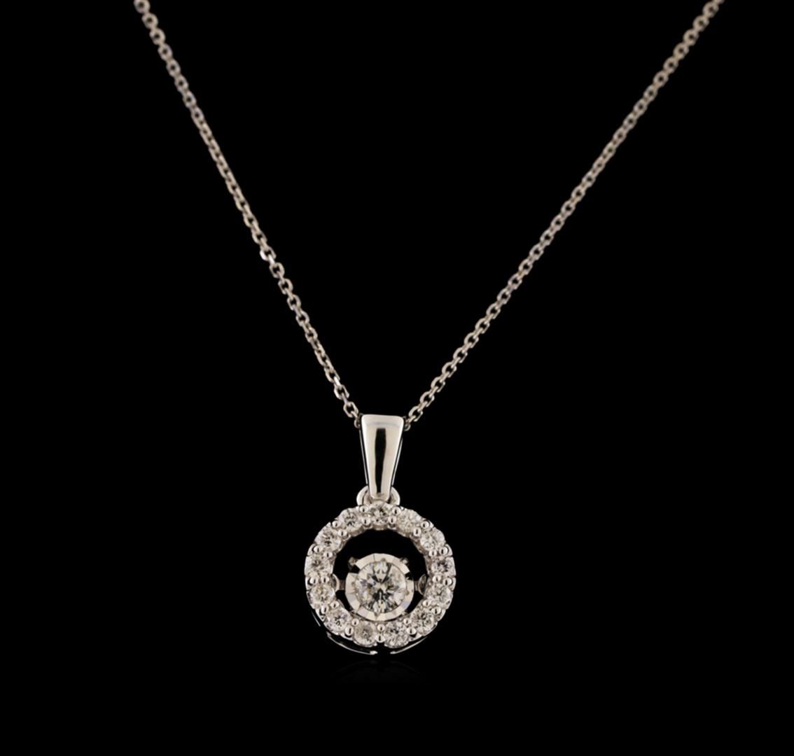 One electronically tested 14KT white gold lady's combination cast & assembled circle pendant & chain 18.0' long, 1mm diamond cut oval cable link with a spring ring clasp with a bright polish finish. The featured lady's pendant has a dancing diamond motif. Identified with markings of '14K'. Condition is new, good workmanship. Containing: One prong set round brilliant cut diamond, measuring 3.50 - 3.45 x 1.98mm (depth est.) approximate weight of 0.15ct. Graded in the setting. Clarity SI-2. Color: G - H Cut Very Good Thirteen prong set round brilliant cut diamonds, measuring 1.60 - 1.50 x 0.93mm (depth est.) approximate total weight of 13 Stones = 0.18ct. Graded in the setting. Clarity SI-2 to I-1. Color: H - I Cut Good. Total Weight of Diamonds 0.33ct.. Total Weight of Pendant & Chain 2.60gm. GAS Appraised at $1,455.00.