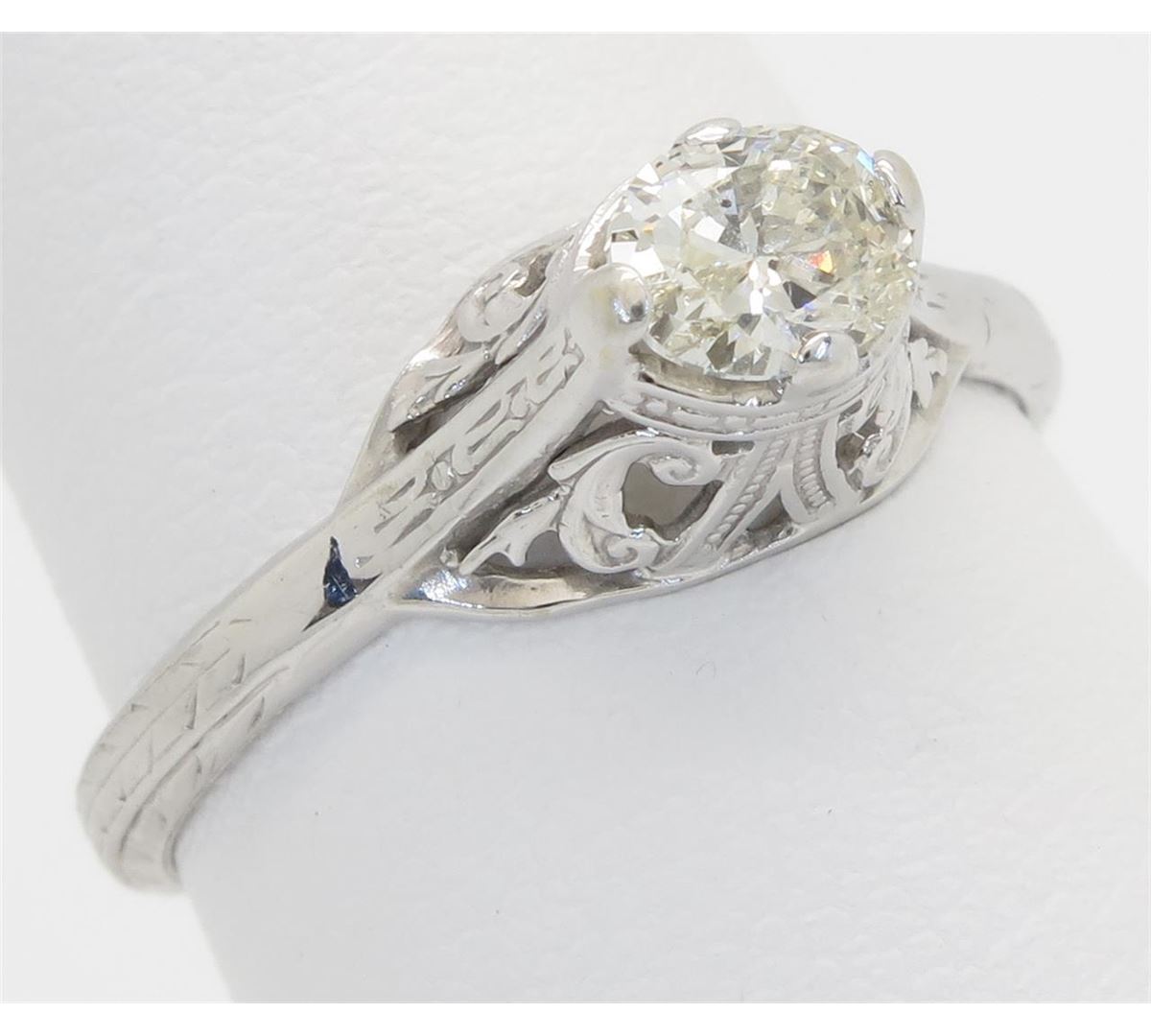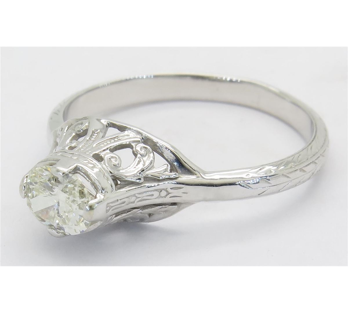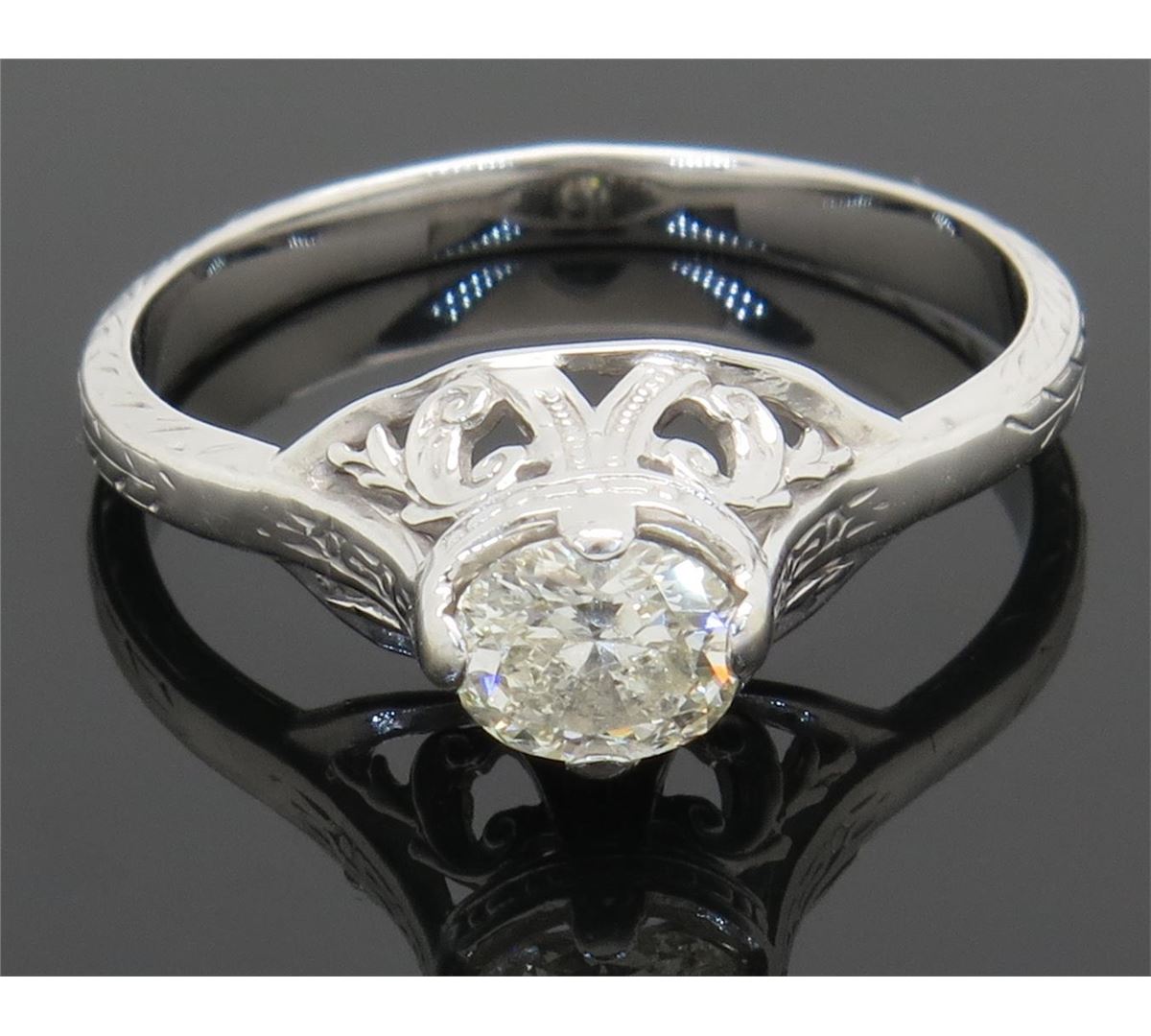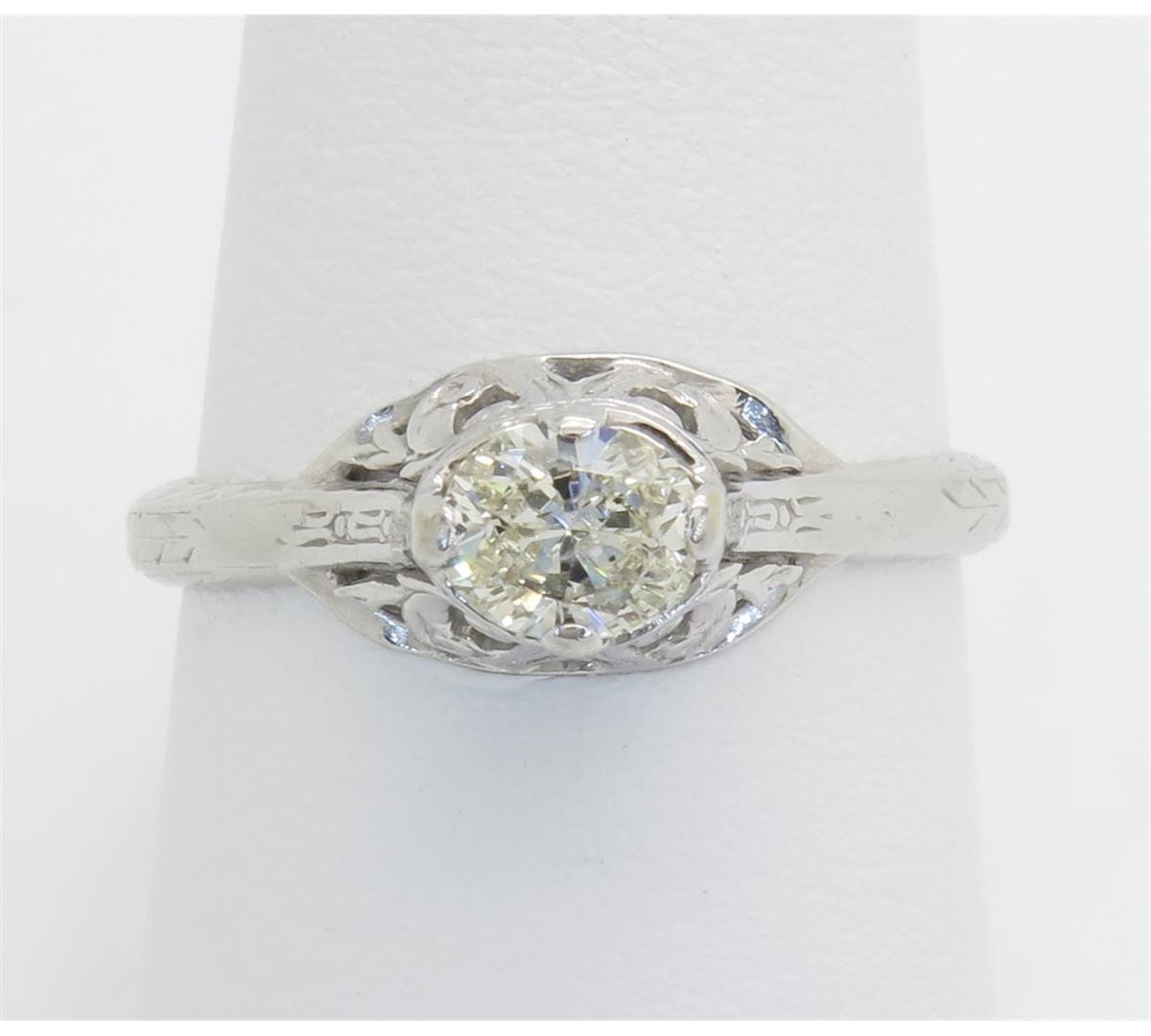 One tested 14K white gold vintage diamond ring. Containing: One Oval Cut Diamond. Approximate weight: .33CT. Clarity: I, Color: J-K. Diamonds are graded in the mounting, unless otherwise stated. Weight of ring: 2.2 grams. Size: 5.75.