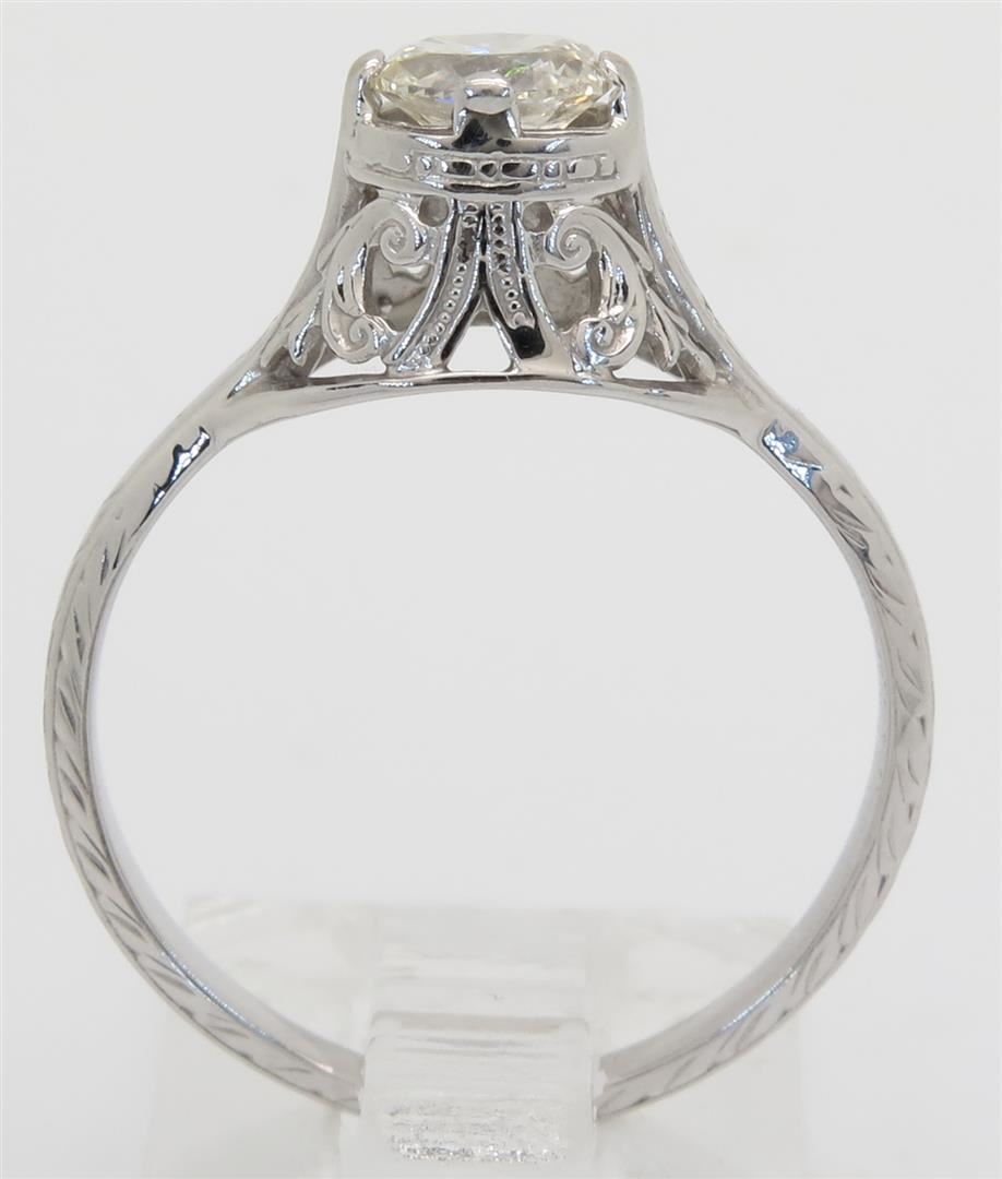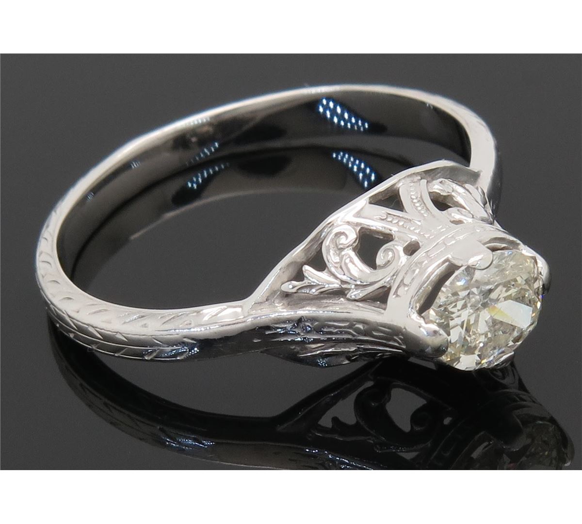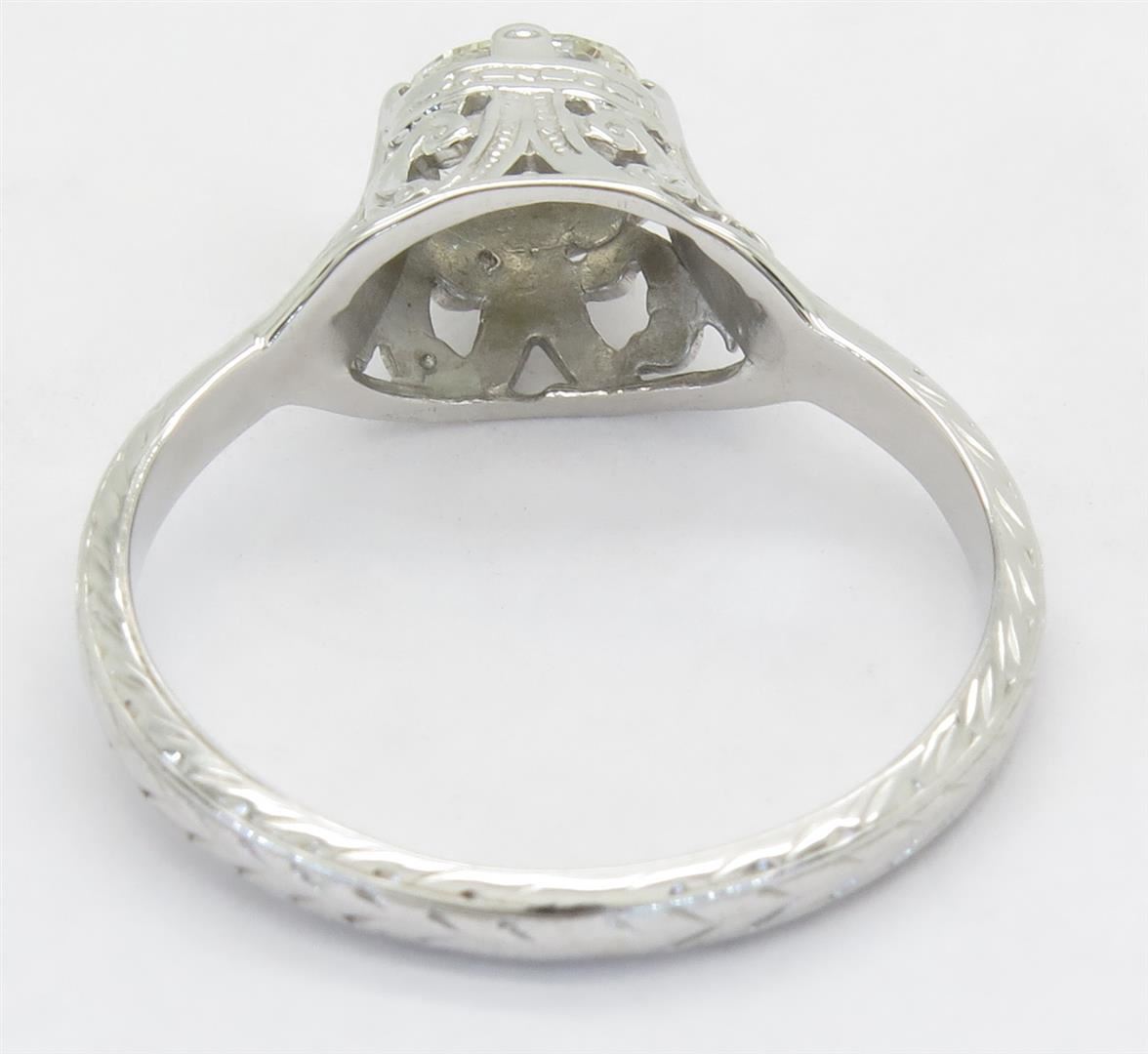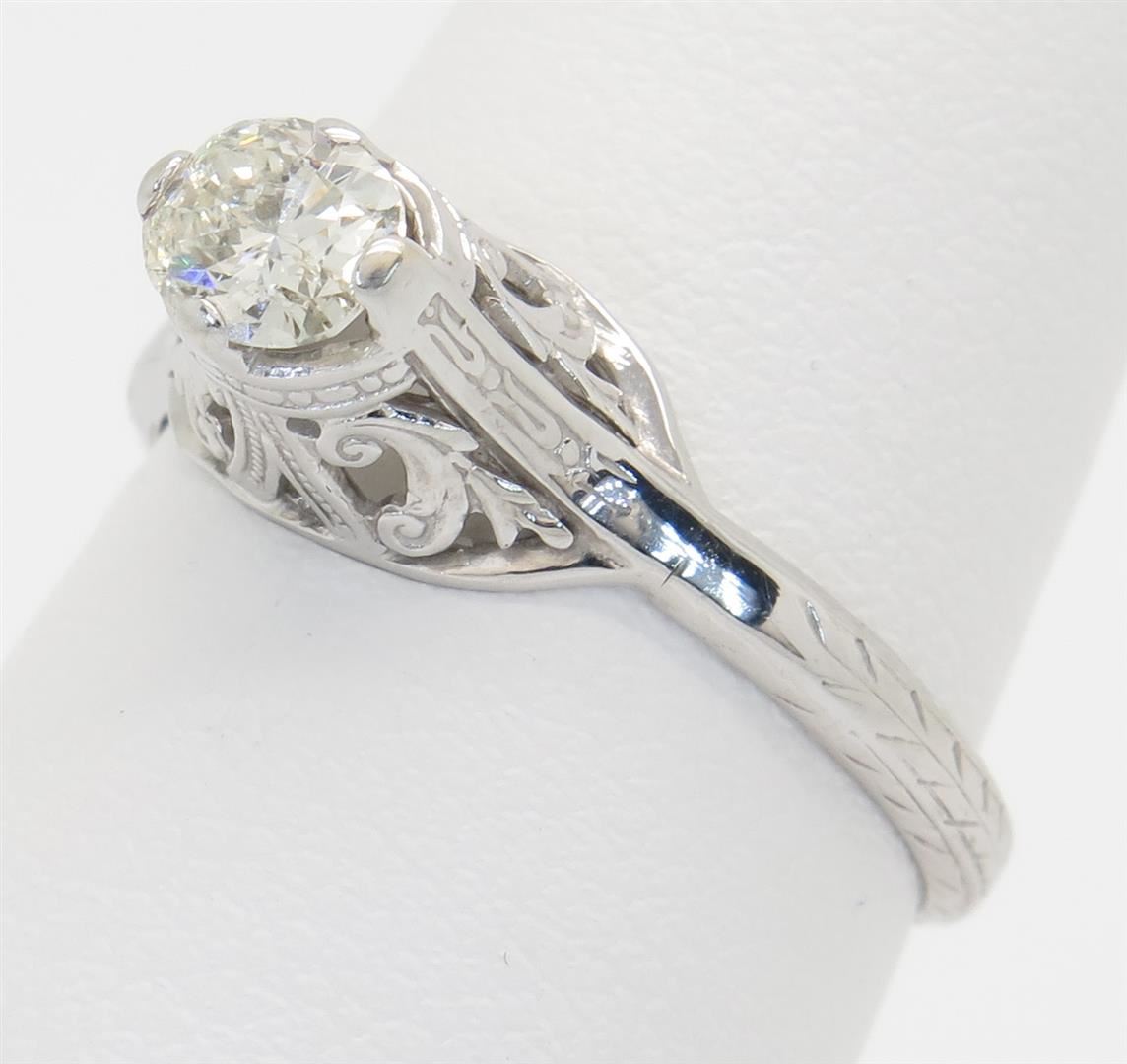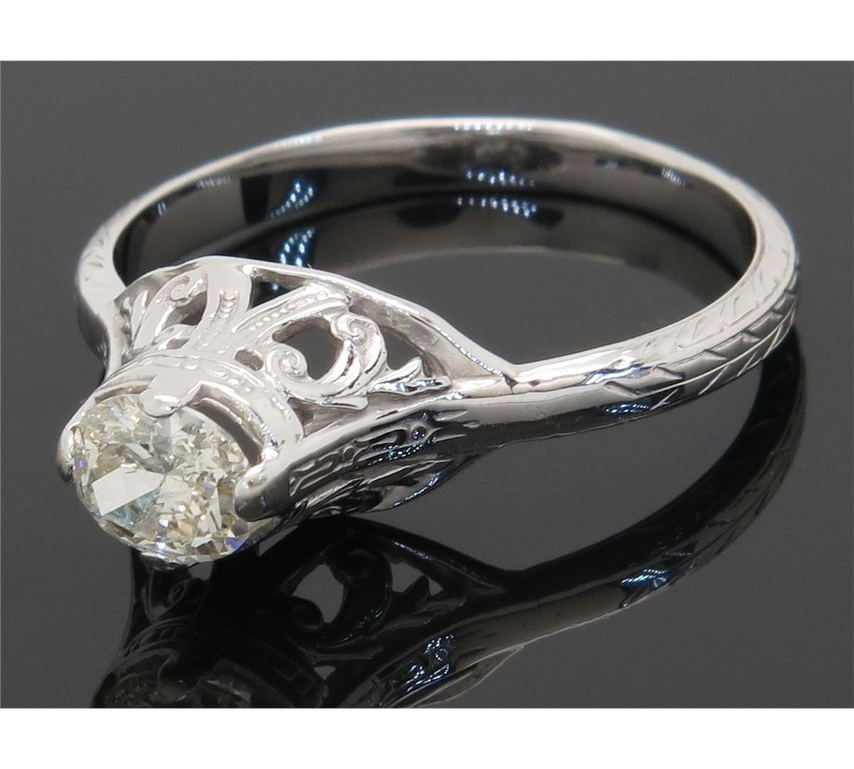 One tested 14K white gold vintage diamond ring. Containing: One Oval Cut Diamond. Approximate weight: .33CT. Clarity: I, Color: J-K. Diamonds are graded in the mounting, unless otherwise stated. Weight of ring: 2.2 grams. Size: 5.75.