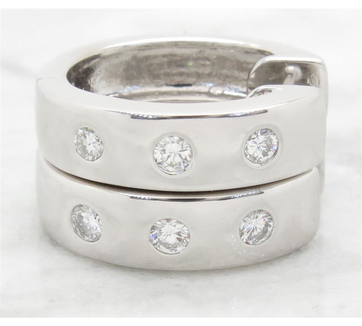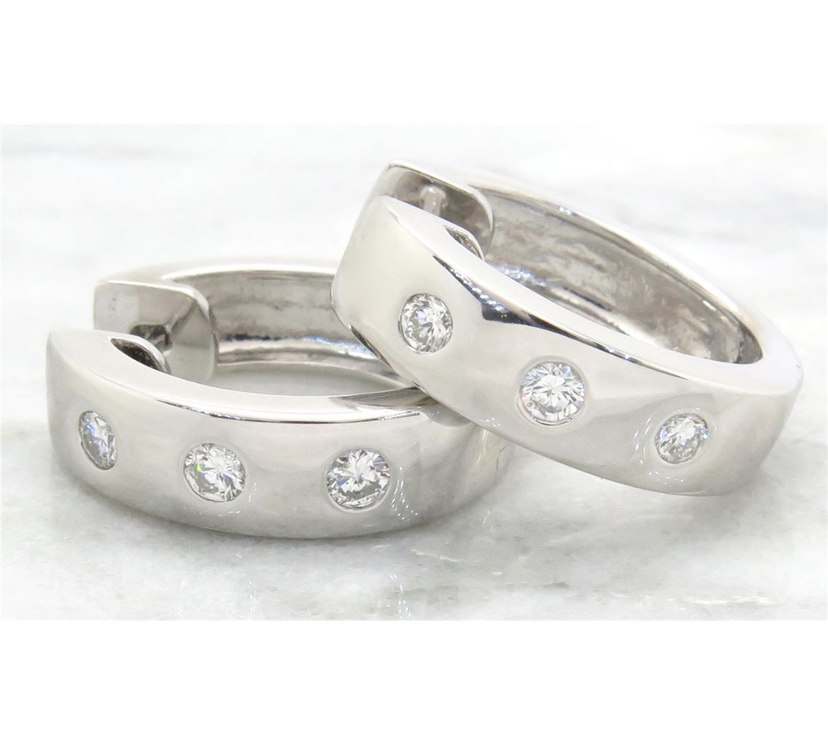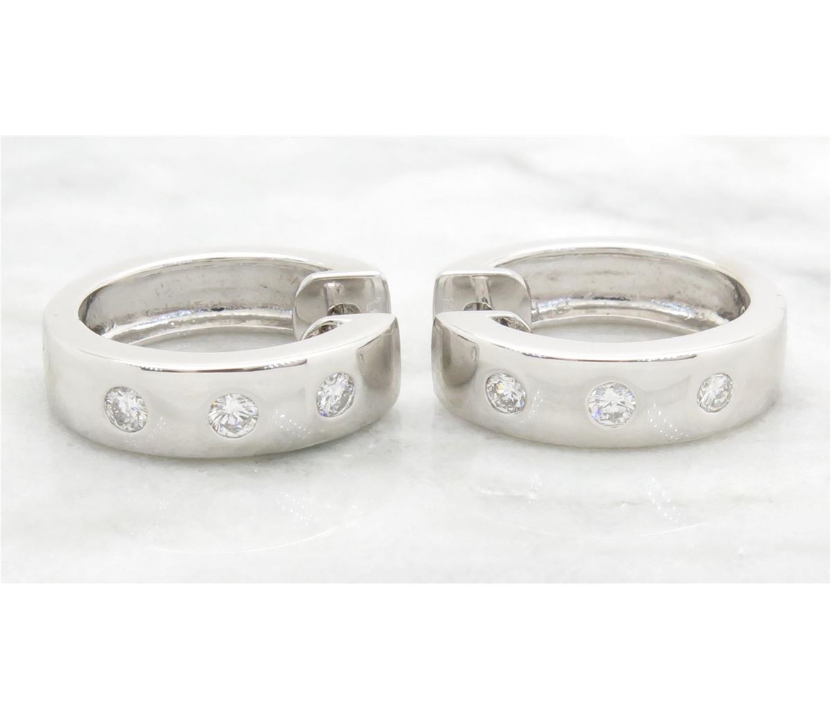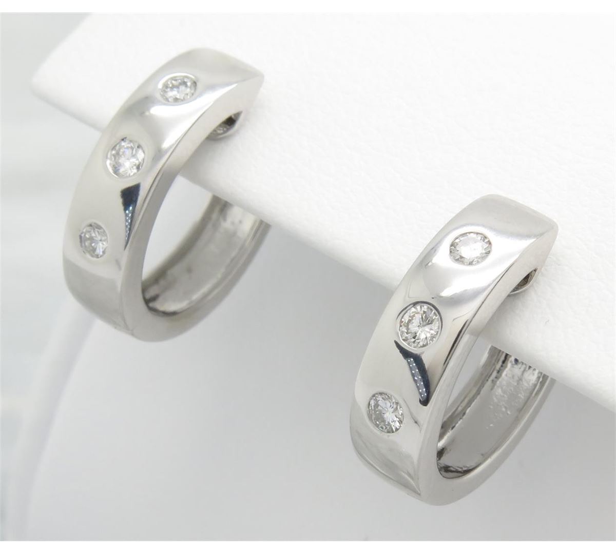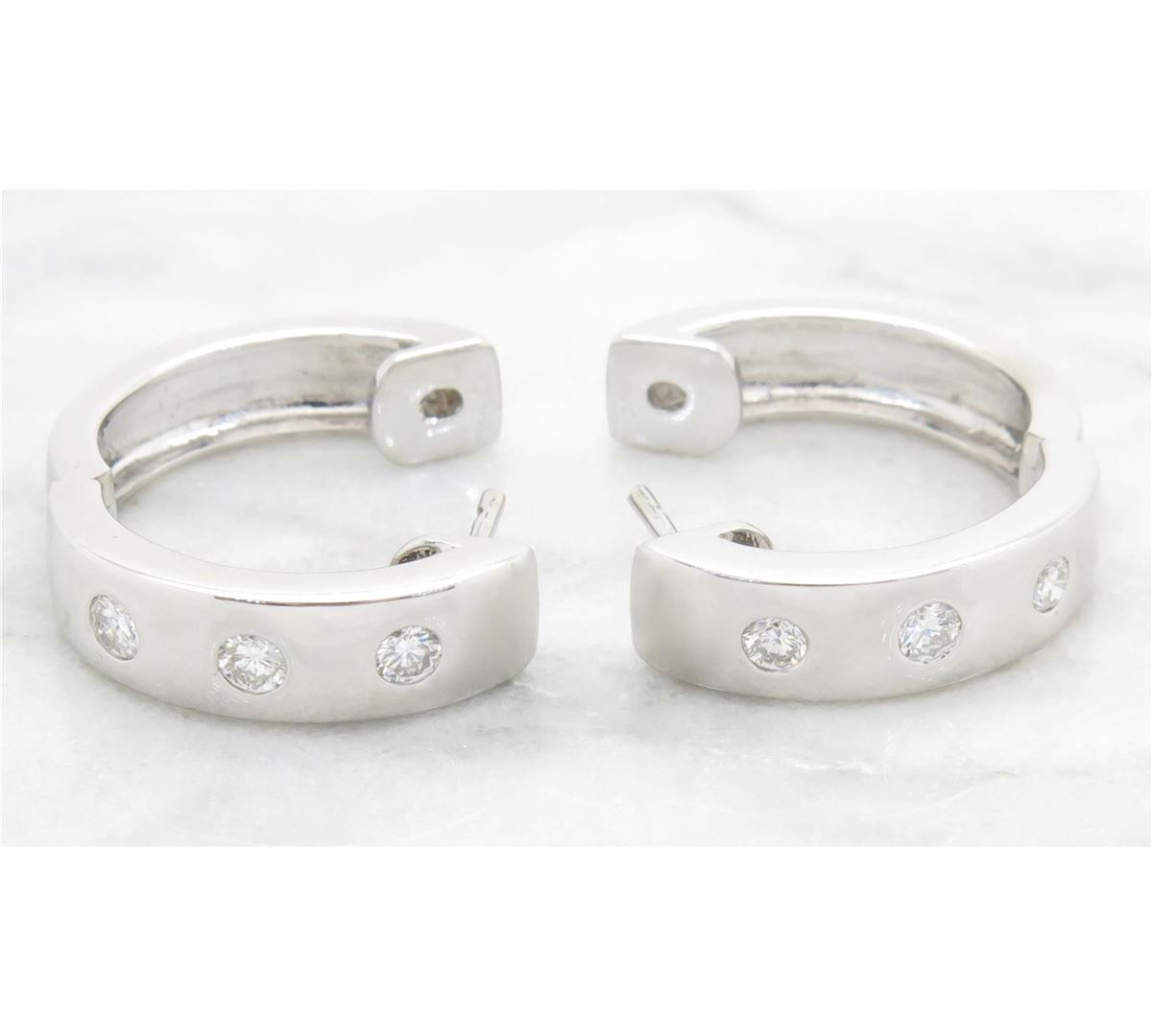 One tested 14K white gold pair of diamond earrings. Containing: Six Round Brilliant Cut Diamonds. Clarity: I-SI, Color: G-H. Approximate total diamond weight: 1/3CTW. Diamonds are graded in the mounting, unless otherwise stated. Weight: 6.9 grams.