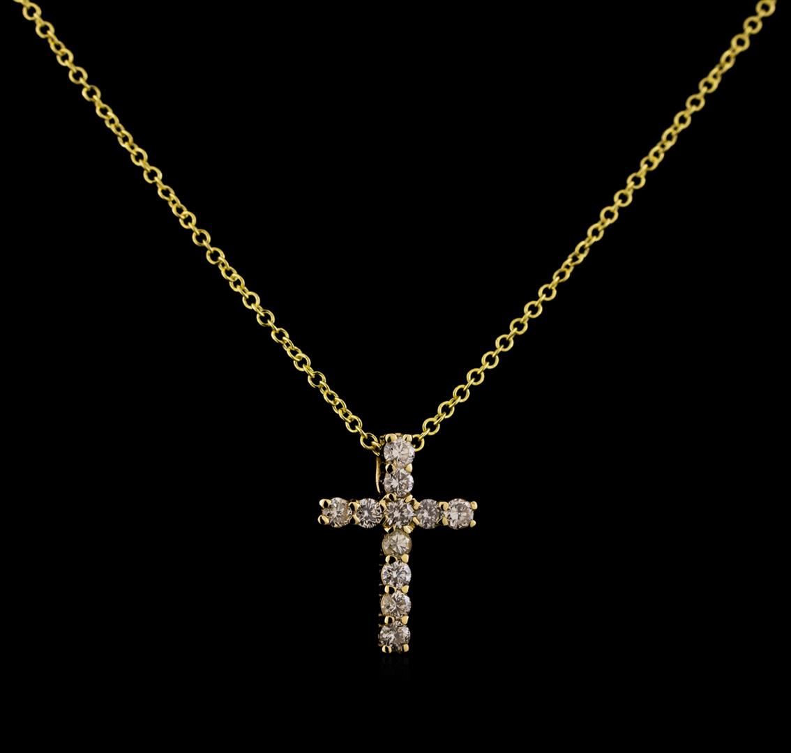 One cross pendant with chain featuring: 14KT yellow gold weighing 1.77 grams containing diamonds weighing 0.34ctw.