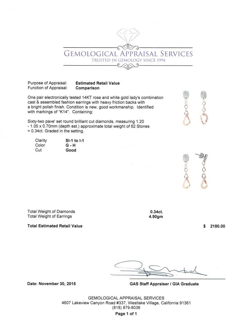 One pair electronically tested 14KT rose and white gold lady's combination cast & assembled fashion earrings with heavy friction backs with a bright polish finish. Identified with markings of "K14". Condition is new, good workmanship. Containing: Sixty-Two pave' set round brilliant cut diamonds, measuring 1.20 - 1.05 x 0.70mm (depth est.) approximate total weight of 62 Stones = 0.34ct. Graded in the setting. Clarity: SI-1 to I-1 . Color: G - Good. Total Weight of Diamonds 0.34ct.. Total Weight of Earrings 4.90gm at $ 2180.00 GAS Appraised.