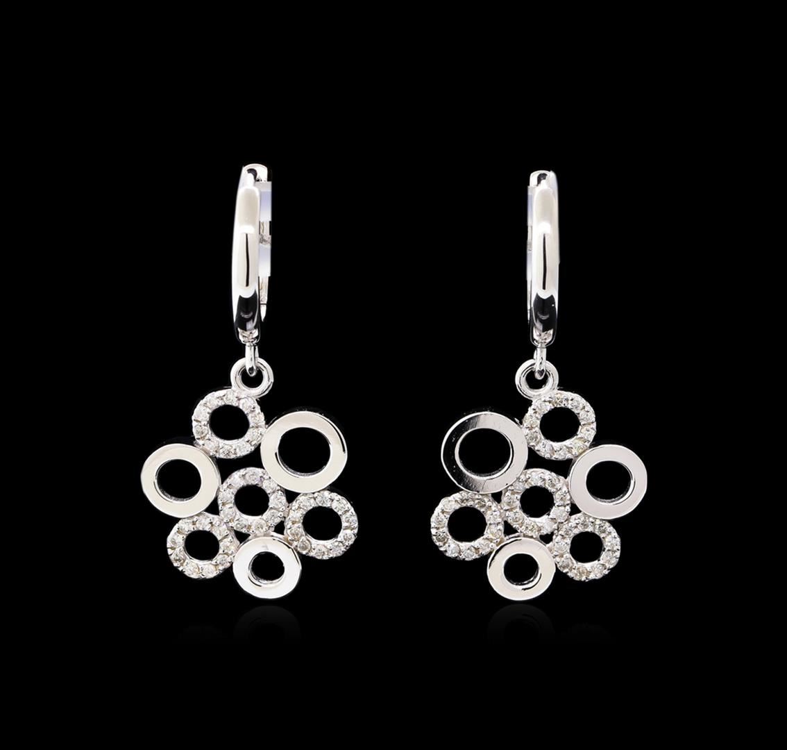 One pair electronically tested 14KT white gold ladies cast & assembled diamond dangle earrings with hinged, snap locking posts. Each earring features a dangling cluster of circles with diamond accents. Bright polish finish. Identified with markings of "585". Condition is new, good workmanship. Containing: Seventy-Six prong set round brilliant cut diamonds, measuring 1.10 - 1.00 x 0.63mm (depth est.) approximate total weight of 76 Stones = 0.34ct. Graded in the setting. Clarity: SI-2 to I-2. Color: G - I. Total Weight of Diamonds 0.34ct. Total Weight of Earrings 4.34gm. AIG Appraised at $1,960.00.