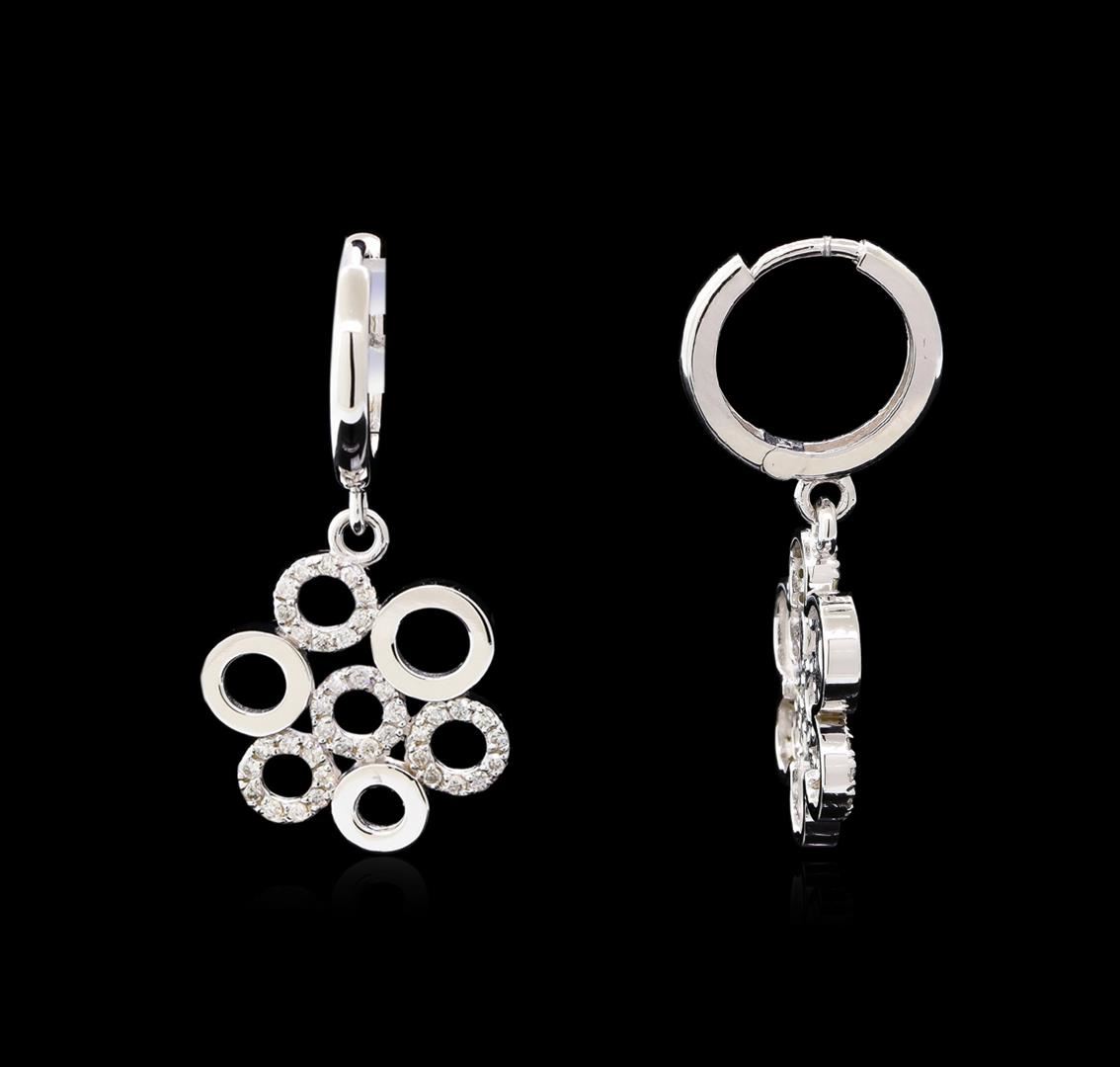 One pair electronically tested 14KT white gold ladies cast & assembled diamond dangle earrings with hinged, snap locking posts. Each earring features a dangling cluster of circles with diamond accents. Bright polish finish. Identified with markings of "585". Condition is new, good workmanship. Containing: Seventy-Six prong set round brilliant cut diamonds, measuring 1.10 - 1.00 x 0.63mm (depth est.) approximate total weight of 76 Stones = 0.34ct. Graded in the setting. Clarity: SI-2 to I-2. Color: G - I. Total Weight of Diamonds 0.34ct. Total Weight of Earrings 4.34gm. AIG Appraised at $1,960.00.