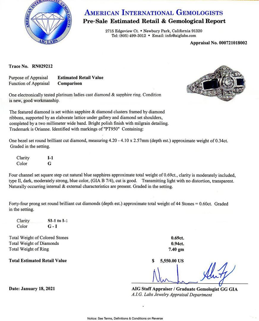 One electronically tested platinum ladies cast diamond & sapphire ring. Condition is new, good workmanship. The featured diamond is set within sapphire & diamond clusters framed by diamond ribbons, supported by an elaborate lattice under gallery and diamond set shoulders, completed by a two millimeter wide band. Bright polish finish with milgrain detailing. Trademark is Orianne. Identified with markings of "PT950" Containing: One bezel set round brilliant cut diamond, measuring 4.20 - 4.10 x 2.57mm (depth est.) approximate weight of 0.34ct. Graded in the setting. Clarity I1 Color G Four channel set square step cut natural blue sapphires approximate total weight of 0.69ctw., clarity is moderately included, type II, dark, moderately strong, blue color, (GIA B 7/4), cut is good. Transmitting light with no distortion, transparent. Naturally occurring internal & external characteristics are present. Graded in the setting. Forty-four prong set round brilliant cut diamonds (depth est.) approximate total weight of 44 Stones = 0.60ctw. Graded in the setting. Clarity SI1 to I1 Color G - I Total Weight of Colored Stones 0.69ctw. Total Weight of Diamonds 0.94ctw. Total Weight of Ring 7.40 gm