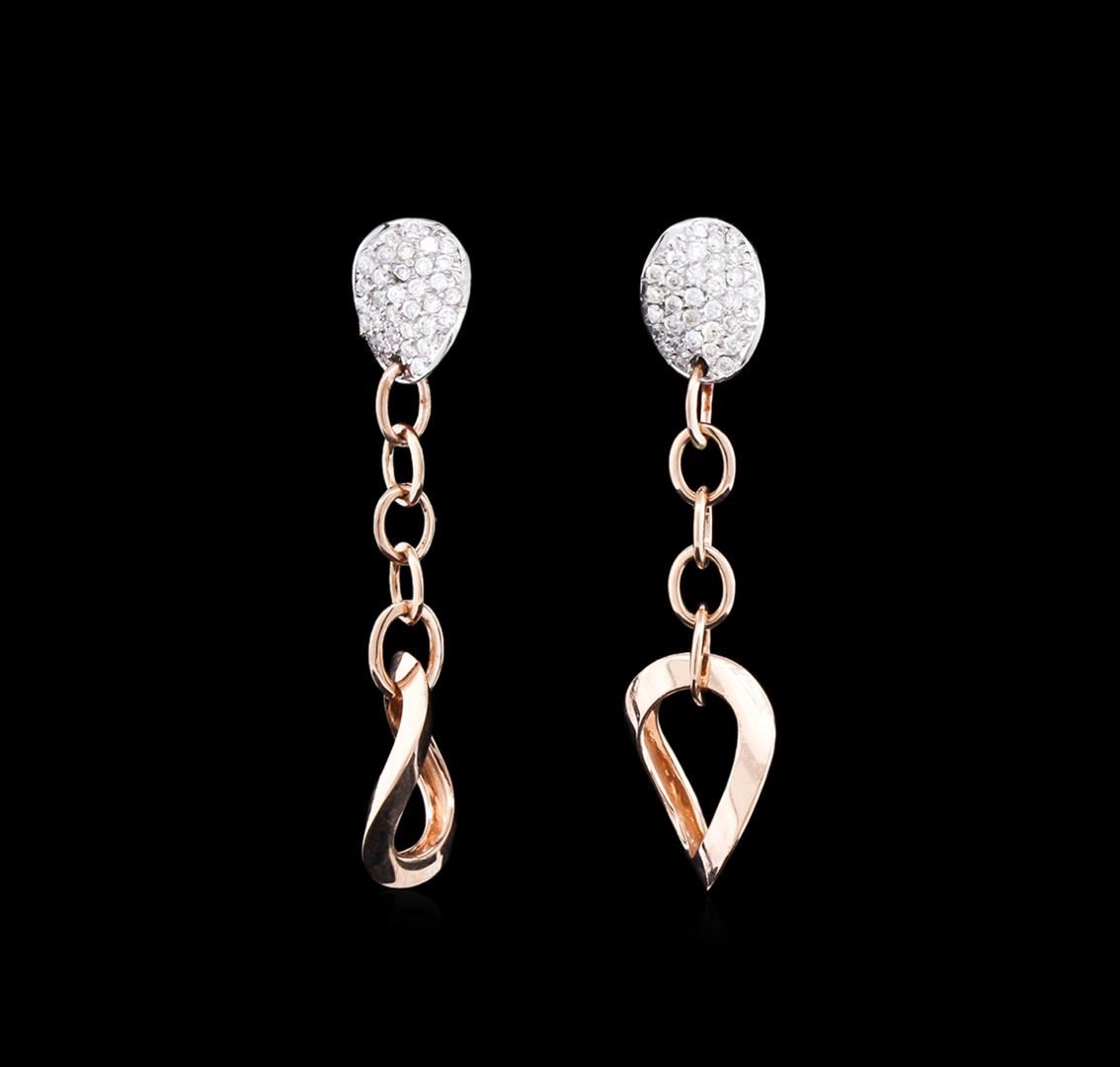 One pair electronically tested 14KT rose and white gold lady's combination cast & assembled fashion earrings with heavy friction backs with a bright polish finish. Identified with markings of "K14". Condition is new, good workmanship. Containing: Sixty-Two pave' set round brilliant cut diamonds, measuring 1.20 - 1.05 x 0.70mm (depth est.) approximate total weight of 62 Stones = 0.34ct. Graded in the setting. Clarity: SI-1 to I-1 . Color: G - Good. Total Weight of Diamonds 0.34ct.. Total Weight of Earrings 4.90gm at $ 2180.00 GAS Appraised.