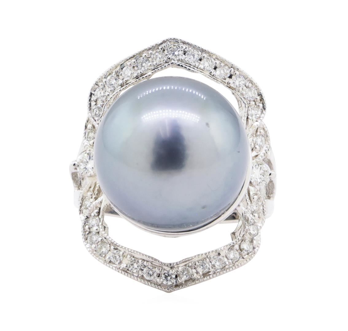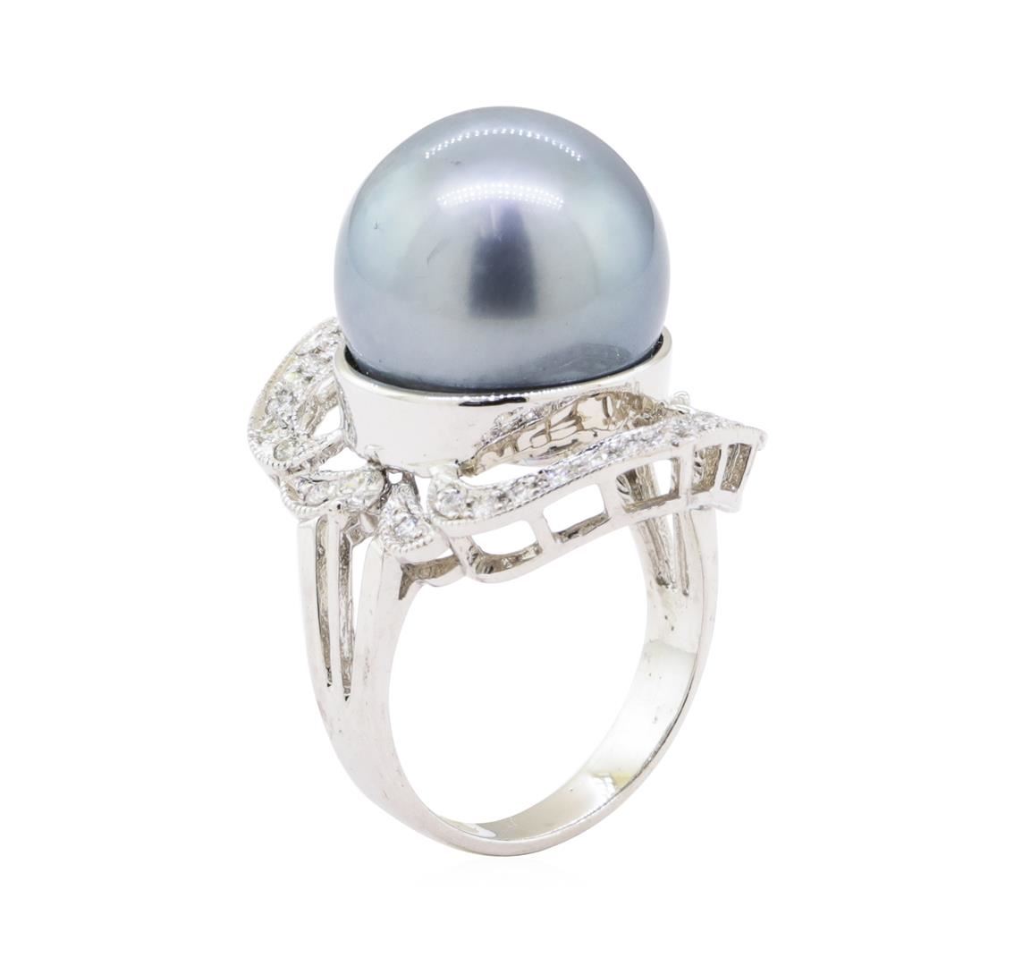 One electronically tested 14KT white gold ladies cast Tahitian cultured pearl and diamond ring. The featured Tahitian cultured pearl is set within a stylized mirroring diamond design supported by three way split shoulders, completed by a three millimeter wide band. Bright polish finish with milgrain detailing throughout. Identified with markings of "K14". Condition is new, good workmanship. Containing: One Tahitian cultured pearl, 13.5mm in size. The pearl is dark silver in color with a very good luster, near round, mostly clean Graded in the setting. Tahitian cultured pearls form in the large "Black Lipped" Pinctada Margaritiferid oyster, which is about twice the size of the Japanese Akoya oyster. This warm water species from across the central and South Pacific Ocean is at home in the bays and lagoons of the islands & atolls of French Polynesia. Tahitian cultured pearl farmers generally raise their oysters in lagoons. Tahitian cultured pearls take from two to four years to form. Black pearls are known for their iridescent, vibrant, almost metallic natural colors, unique among saltwater cultured pearls. Though commonly called "Tahitian" pearls, they are actually gray, to a lighter or darker degree. Tahitian pearls have the unique ability to display a variety of colors at the same time, which can be seen glistening on their surface. Thirty-Two bead set round brilliant cut diamonds approximate total weight of 32 Stones = 0.35ct. Graded in the setting. Clarity VS-1 to SI-1 Color F - H Total Weight of Diamonds 0.35 ct. Total Weight of Ring 8.54 gm Estimated Retail Value $ 4,280.00 US