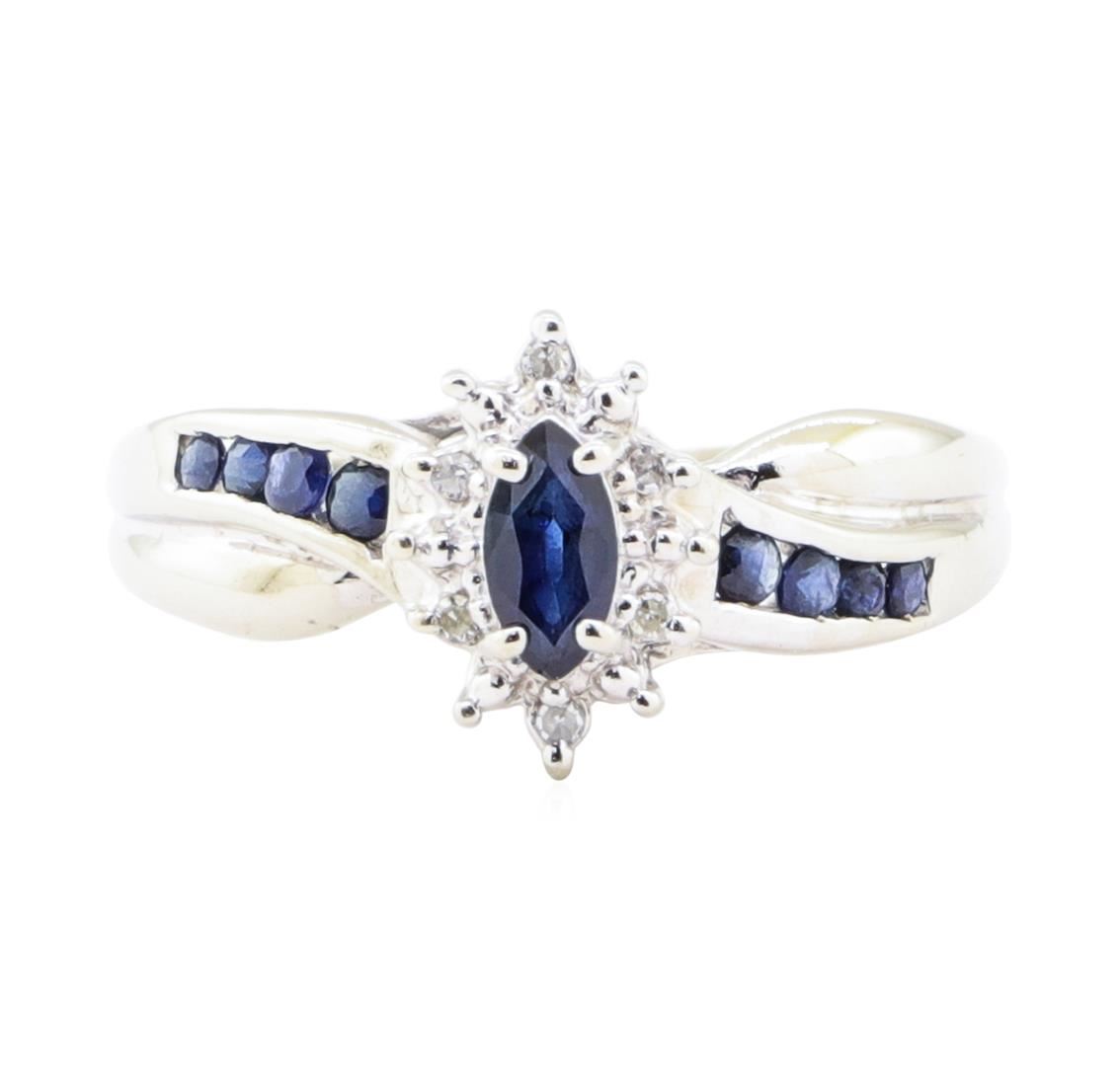 One designer bypass ring with a halo featuring: 10KT white gold weighing 2.7 grams containing sapphires weighing 0.30 ctw and diamonds weighing 0.05ctw.