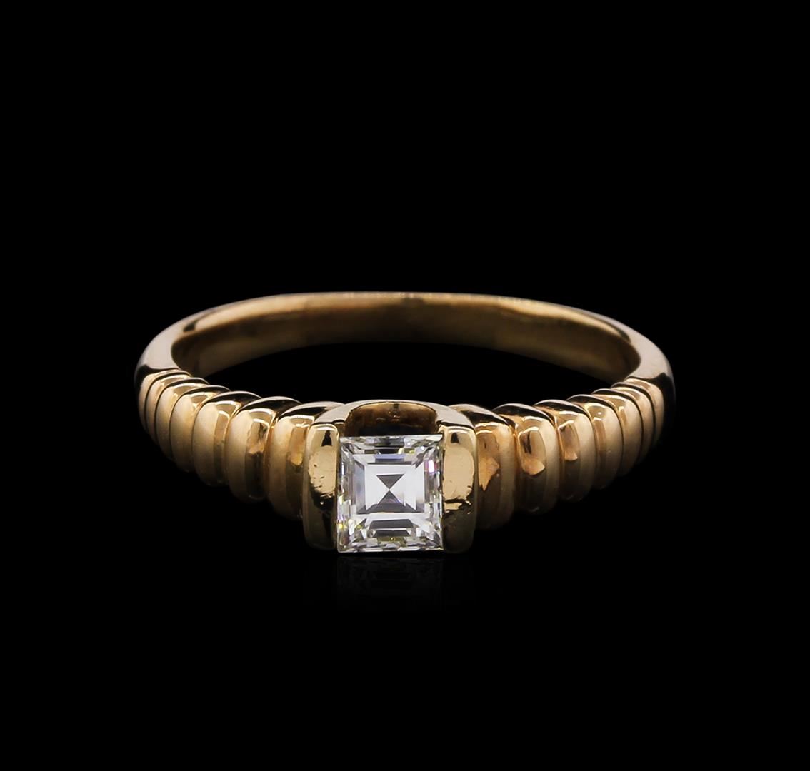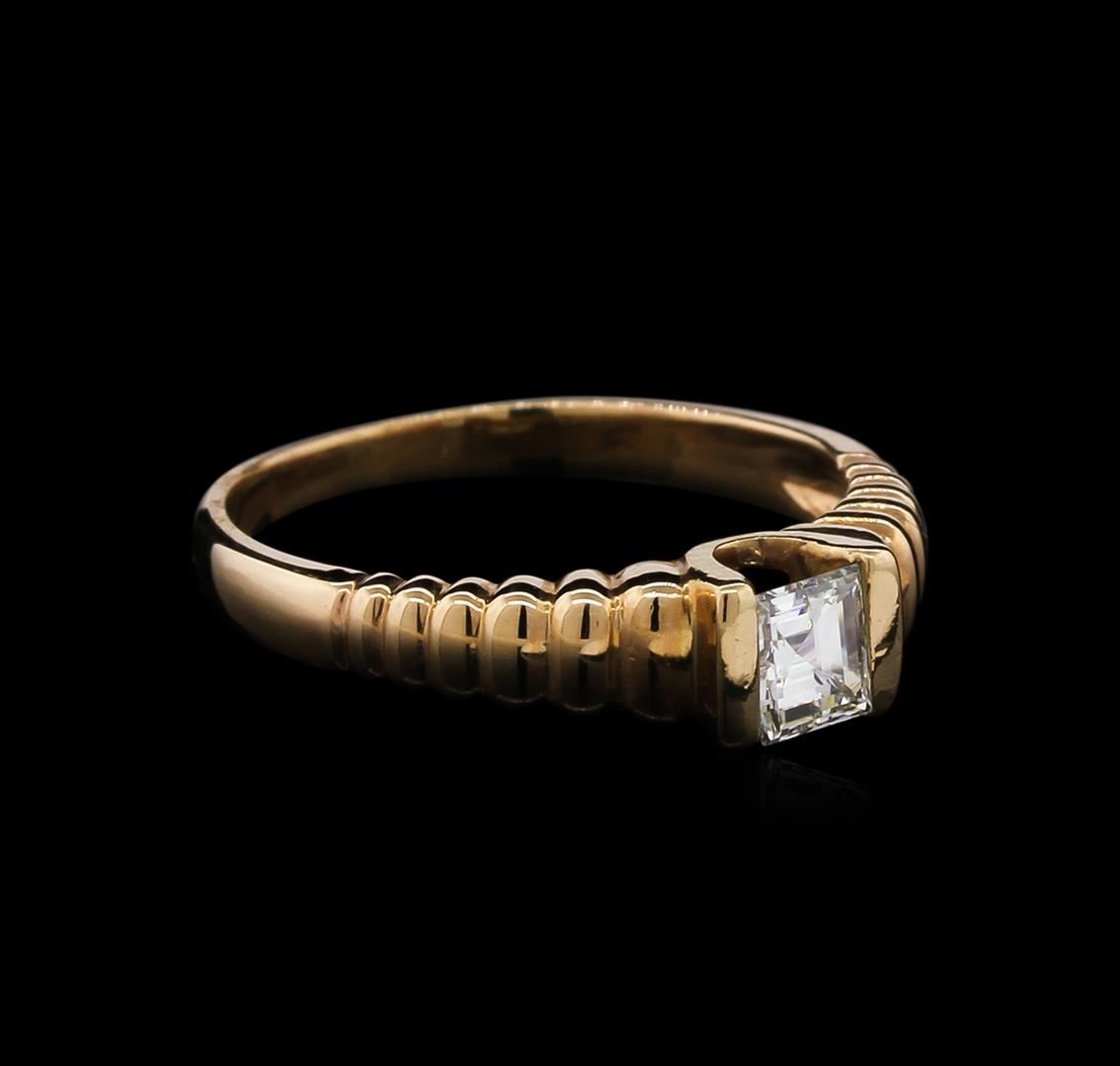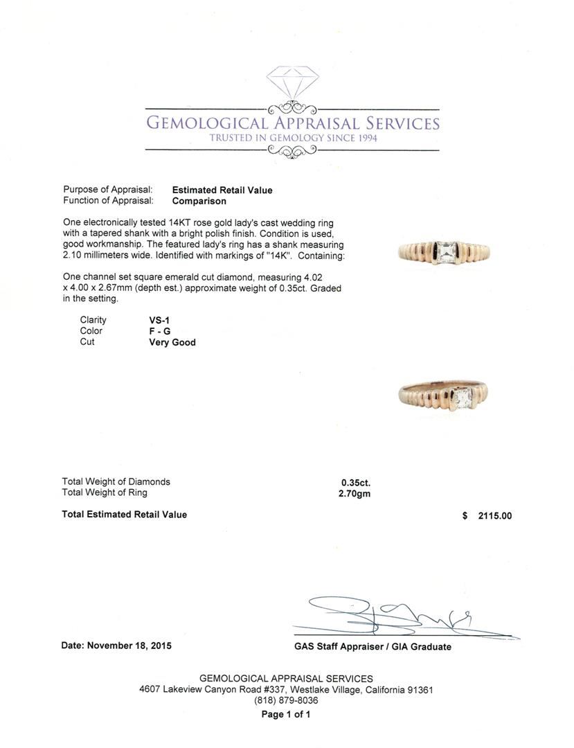 One electronically tested 14KT rose gold lady's cast wedding ring with a tapered shank with a bright polish finish. The featured lady's ring has a shank measuring 2.10 millimeters wide. Identified with markings of "14K". Condition is used, good workmanship. Containing: One channel set square emerald cut diamond, measuring 4.02 x 4.00 x 2.67mm (depth est.) approximate weight of 0.35ct. Graded in the setting. Clarity: VS-1. Color: F - G. Cut Very Good. Total Weight of Diamonds 0.35ct. Total Weight of Ring 2.70gm. GAS Appraised.